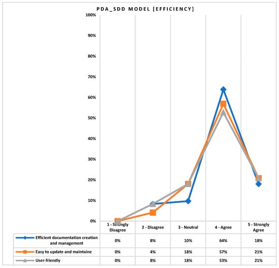 For efficiency, a significant majority of respondents (82%) expressed agreement or strong agreement that the model enables the creation and management of documentation in an effective and efficient manner (Figure 17). Furthermore, a substantial 78% concurred that the adoption of the model facilitates the subsequent tasks of updating and maintaining documentation.
