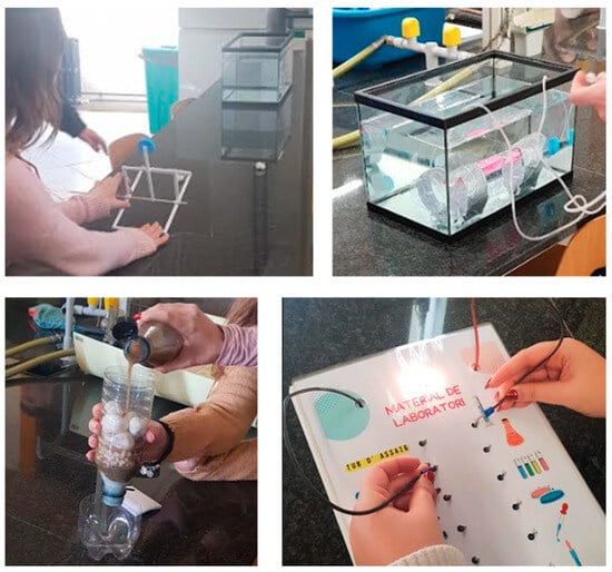 The narrative remained organized around four kingdoms—Science, Chemistry, Energy, and Challenges—each corresponding to one of the RESC course’s curricular blocks and ruled by one of four central characters: Clarissa of Curiosity, Elixia of Essence, Beric the Brilliant, and the antagonist Morgana the Schemer, respectively. The plot centered on Morgana’s invasion, which had disrupted the balance of scientific knowledge across the realms. To restore order, students embarked on a collaborative journey through the kingdoms, solving challenges and completing missions tied to course content. The adventure culminated in a final confrontation at Morgana’s castle, where students showcased the finished STEM products they had developed (Figure 3), determining whether peace would be restored to the kingdoms. To ensure individual accountability within these cooperative projects, a combination of peer assessment and self-assessment was employed, allowing the final grade to be adjusted fairly to reflect each member’s actual involvement and responsibility [99].