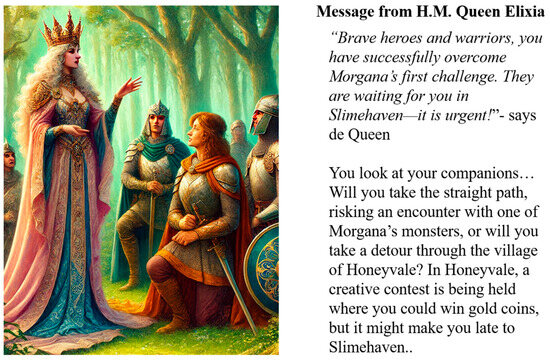 Example of a narrative slide projected during class, accompanied by medieval-style background music, representing a branching point in the story where the class must make a consequential decision. In this scenario, the students must choose whether to take the direct path—risking an unknown encounter—or to detour through the village of Honeyvale (where they will work on density), knowing this may make them late to Slimehaven (where they will experiment with polymers). Depending on their choice, the story unfolds differently: taking the direct route ultimately leads to a “monster battle” (see Figure 2), while the detour allows them to avoid confrontation but miss out on a timely arrival… The picture of this slide was generated with GPT-4o.