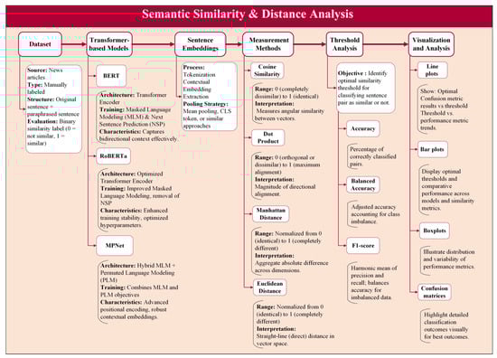 Surveys such as Vrublevskyi & Marchenko grouped these pre-neural approaches into three broad families: rule-based, ontology-driven, and classical machine-learning. These categorizations provide a high-level overview; they also reveal that early evaluations often relied on only a single Similarity metric applied to relatively small datasets []. Against this backdrop, transformer-based architectures have become the default choice because of their contextualized embedding capabilities. BERT [] introduced deep bi-directional representations, while RoBERTa [,] refined training procedures and data preprocessing. Meanwhile, MPNet [] combined the advantages of masked and permuted language modeling, achieving notable success in various semantic understanding tasks. Focusing on practical evaluation, Kim et al. [] compared multiple models on GLUE benchmark tasks, including paraphrase and text similarity, and found that RoBERTa consistently outperformed or matched other models, underscoring its robustness across diverse evaluation settings.