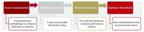 Because the above Similarity metrics yield continuous scores, a decision threshold must be applied to classify pairs as paraphrases (label = 1) or not (label = 0). As illustrated in Figure 2, threshold analysis was performed to determine the optimal cut-off for each model-metric combination for the paraphrase assessment.