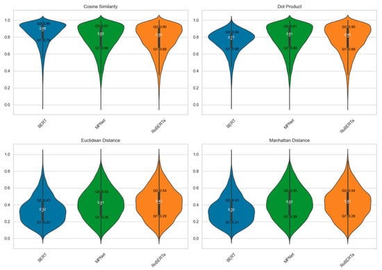 Figure 3 illustrates the violin plots that display the normalized distributions of similarity and distance scores for BERT, MPNet, and RoBERTa across the four measures including cosine similarity, dot-product, Euclidean distance, and Manhattan distance. To enable direct comparison, normalization was applied independently to each model-metric pair, yielding relative rankings such as quartiles and spread. The distributions for all models demonstrate a negative skew towards high similarity. BERT exhibits a particularly long and narrow tail. While MPNet and RoBERTa visually present slightly wider distributions than BERT, MPNet’s distribution appears marginally narrower than RoBERTa’s. This concentration of values towards high similarity, i.e., towards one for cosine and dot-product, towards zero for Euclidean and Manhattan distances, is due to the imbalanced dataset containing larger proportion of similar pairs. The observed patterns show that the sentence embedding of these models could effectively capture the inherent structure of the data.