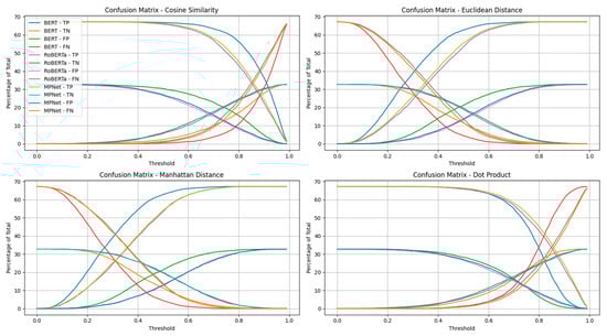 Threshold-dependent confusion matrix dynamics for three transformer-based sentence embedding models (BERT, RoBERTa, and MPNet) across four similarity/distance metrics (cosine similarity, Euclidean distance, Manhattan distance, and dot product). Each curve represents the proportion of total predictions assigned to a confusion matrix category (TP, TN, FP, FN). At low thresholds, true positives dominate at the expense of false positives, whereas at high thresholds, true negatives dominate but false negatives rise. Mid-range thresholds provide a better balance between correct classifications and errors. MPNet shows more stable performance across metrics, while cosine similarity and dot product yield smoother tradeoffs than distance-based measures.