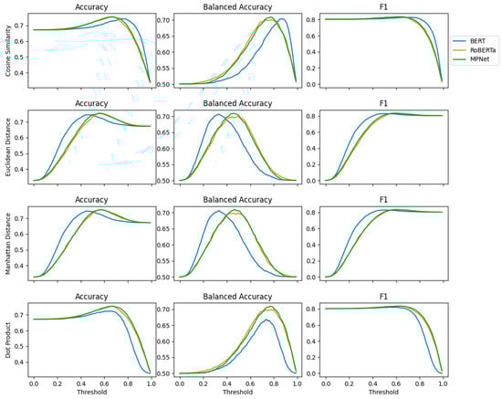 Table 6 shows the models that reached the performance peak value and similarity/distance measure quantified to calculate the peak performance metric along with the threshold associated with the optimal measure. BERT is notably absent from the top-performing models, while RoBERTa appeared three times with peak accuracy. In contrast, MPNet appeared nine times achieving peak performance with all three metrics. At first glance, each similarity or distance measure appears three times in the table, which might suggest comparable performance across methods. However, the patterns observed in Figure 4 revealed important differences. For example, BERT and RoBERTa performed worse when using dot-product compared to cosine similarity. Interestingly, BERT’s performance improved when using Manhattan or Euclidean distance instead of cosine similarity. This is particularly noteworthy because cosine similarity is widely used as a standard measure, yet it yields suboptimal results for BERT here. A less obvious but important observation is that MPNet paired with Manhattan distance produces the highest F1 score peak of any distance measure. The optimal thresholds vary considerably, ranging from 0.334 to 0.867 (Figure 5), indicating that a single, universally applicable threshold is difficult to define. This variability underscores the importance of task-specific calibration rather than relying on a fixed threshold.