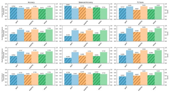 Figure 5 presents a comparative analysis of three models across similarity and distance metrics. Across all metrics, a consistent pattern exists where performance generally improves as the threshold increases from zero toward an optimal range at approximately 0.6–0.8, after which accuracy and F1-score tend to decline. For Cosine Similarity, all three models show peak performance around thresholds of 0.7–0.8, with MPNet and RoBERTa maintaining slightly higher stability in accuracy and F1 in comparison with the BERT that has more variation at the extreme values. Euclidean Distance and Manhattan Distance display similar trends, where performance rises steadily to a peak and then falls sharply as the threshold approaches one. Particularly, models have similar trends in the mid-threshold range and the differences are visible at low thresholds, where BERT performed slightly lower in F1-score. For Dot-Product, the trends are similar as the Cosine Similarity, with performance peaks at 0.7–0.8 threshold. MPNet and RoBERTa demonstrate smoother, more stable trends suggesting more consistency compared to BERT. The Balanced Accuracy plots, in particular, highlight that small threshold changes in the optimal range can shift performance noticeably, indicating that fine-tuning the threshold is essential for maximizing classification fairness across classes. Overall, these results suggest that while all three models perform competitively in the optimal threshold range, MPNet and RoBERTa generally provide slightly more consistent results across metrics, whereas BERT’s performance is more sensitive to threshold variation. This indicates that model choice and threshold calibration both play important roles in achieving reliable semantic similarity classification.