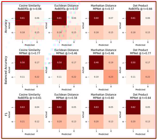 As can be expected, the disparity between FN and FP is lower for balanced accuracy. The lowest percentage of misclassification at 24% was obtained when optimizing accuracy using cosine similarity closely followed by Manhattan distance, and dot-product. The highest percentage of misclassification at 29% occurred when optimizing balanced accuracy using Manhattan distance as the similarity-measure. MPNet among the three models explored in this study frequently outperformed the other two models based on different performance metrics and using different similarity-measures. The same threshold was found optimizing cosine-similarity and dot-product to achieve peak performance quantified by accuracy and balanced accuracy. Similarly for Euclidean and Manhattan distances. However, for F1-score, a different threshold was found for each similarity-measure yielding the peak performance.
