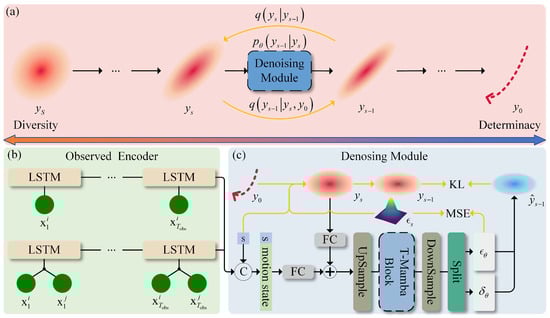 Mamba [36] is recognized for its ability to handle long-range dependencies, which relies on a structured State Space Model (SSM) [49] mechanism that offers excellent memory and computational efficiency, thereby improving both its practicality and performance. Hippo [50] represents a key contribution to SSMs, establishing their effectiveness in long-sequence modeling tasks. Subsequent research [51] further refined the underlying mechanisms of SSMs by introducing a selective mechanism, leading to significant performance improvements. In time series tasks, Mamba-based approaches [52,53] have shown clear advantages, providing a theoretical basis for the stochastic trajectory prediction method studied in this paper.
