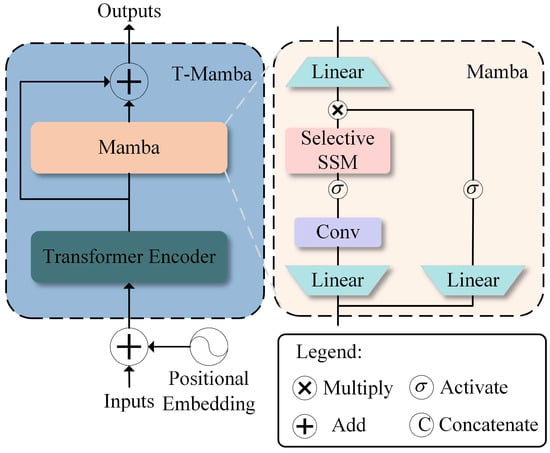 We design a dedicated denoising module for the iDMa architecture tailored to the characteristics of trajectory data, as illustrated in Figure 1b,c. The module follows an encoder–decoder structure. Specifically, the encoder inherits partial encoding components from Trajectron++ [9], adopts hierarchical bidirectional LSTM modules to extract the temporal motion characteristics of the target and its social interaction features with neighboring entities from the input historical trajectory and then concatenates these two types of features to form a latent feature representation f that simultaneously encodes temporal dynamics and social correlations. The decoder consists of the proposed T-Mamba block (see Figure 2), which integrates the Transformer encoder and Mamba block. This design addresses the limitations of standard Transformer, where MLP components exhibit limited spatial relationship modeling capabilities between sequence elements. It also reduces the computational cost associated with stacked attention layers, while achieving stronger performance in capturing key positional dependencies in trajectory sequences.