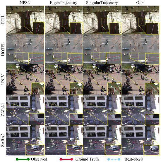 For a more intuitive evaluation of model performance, we conduct a visual comparison on the ETH-UCY dataset, comparing our method with several existing approaches: NPSN [62], EigenTrajectory [56], and SingularTrajectory [47]. As shown in Figure 5, the historical trajectories, GT future trajectories, and predicted trajectories are represented by green curves, red curves, and blue dashed lines, respectively. Notably, the blue dashed lines correspond to the optimal predicted trajectories selected from 20 generated samples, which exhibit the closest alignment with the GT trajectories. To highlight the performance differences more clearly, we select a representative sample from each scene for zoomed-in qualitative analysis.