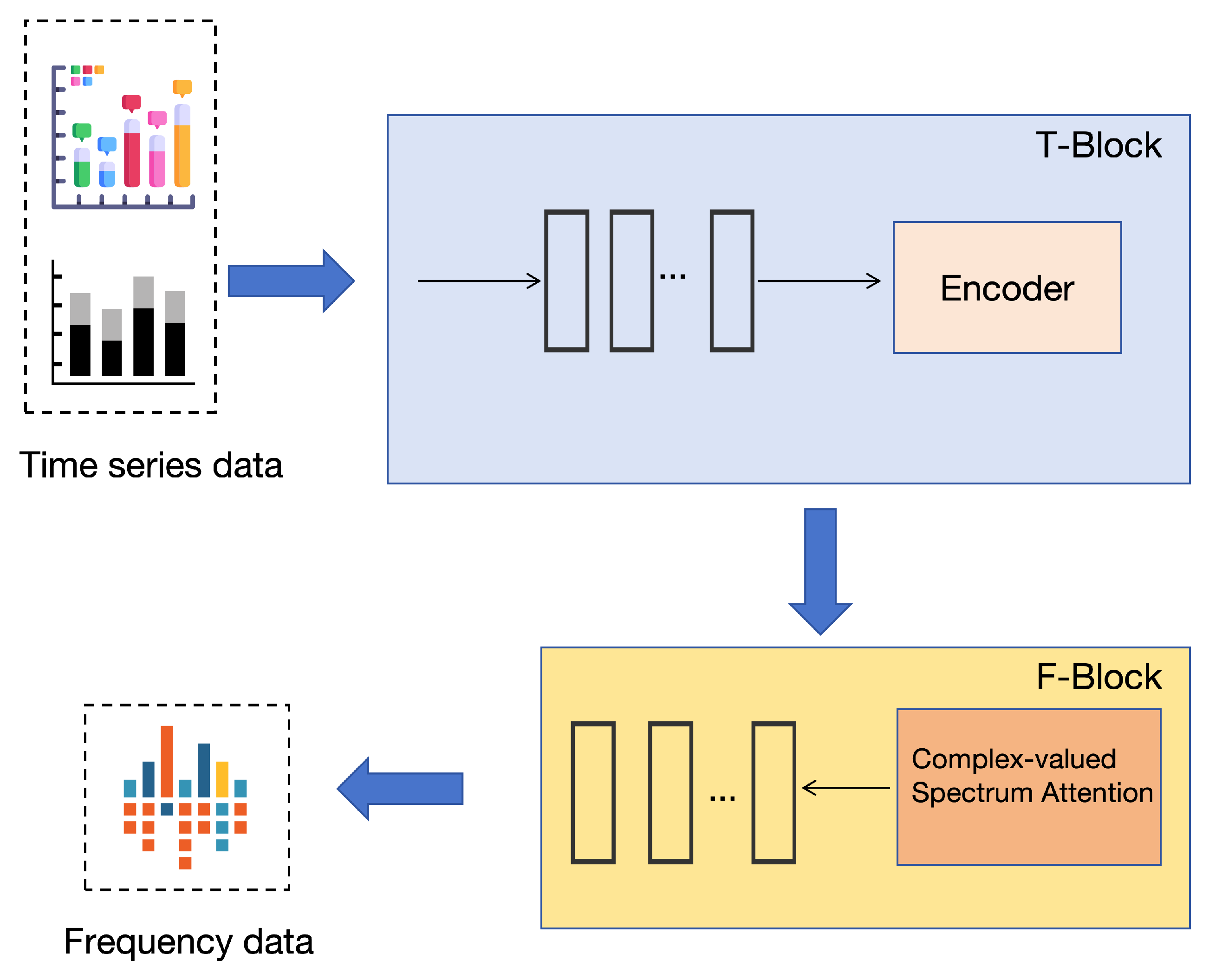 - If the frequency-domain processing module (F_Block) is enabled, the above features are reshaped into (batch size, feature dimension, 1) and passed into the F_Block. The predicted sequence is generated, and the last time step is taken to obtain frequency-domain features of shape (batch size, output feature dimension).