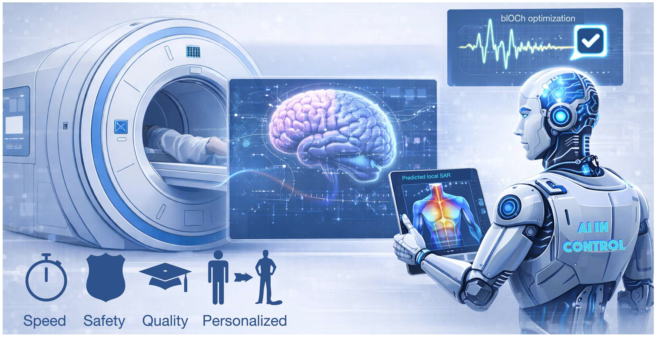 - Lu, Z.; Liang, H.; Lu, M.; Wang, X.; Yan, X.; Huo, Y. Fast-RF-Shimming: Accelerate RF shimming in 7T MRI using deep learning. Meta-Radiology 2025, 3, 100166. [Google Scholar] [CrossRef] [PubMed]