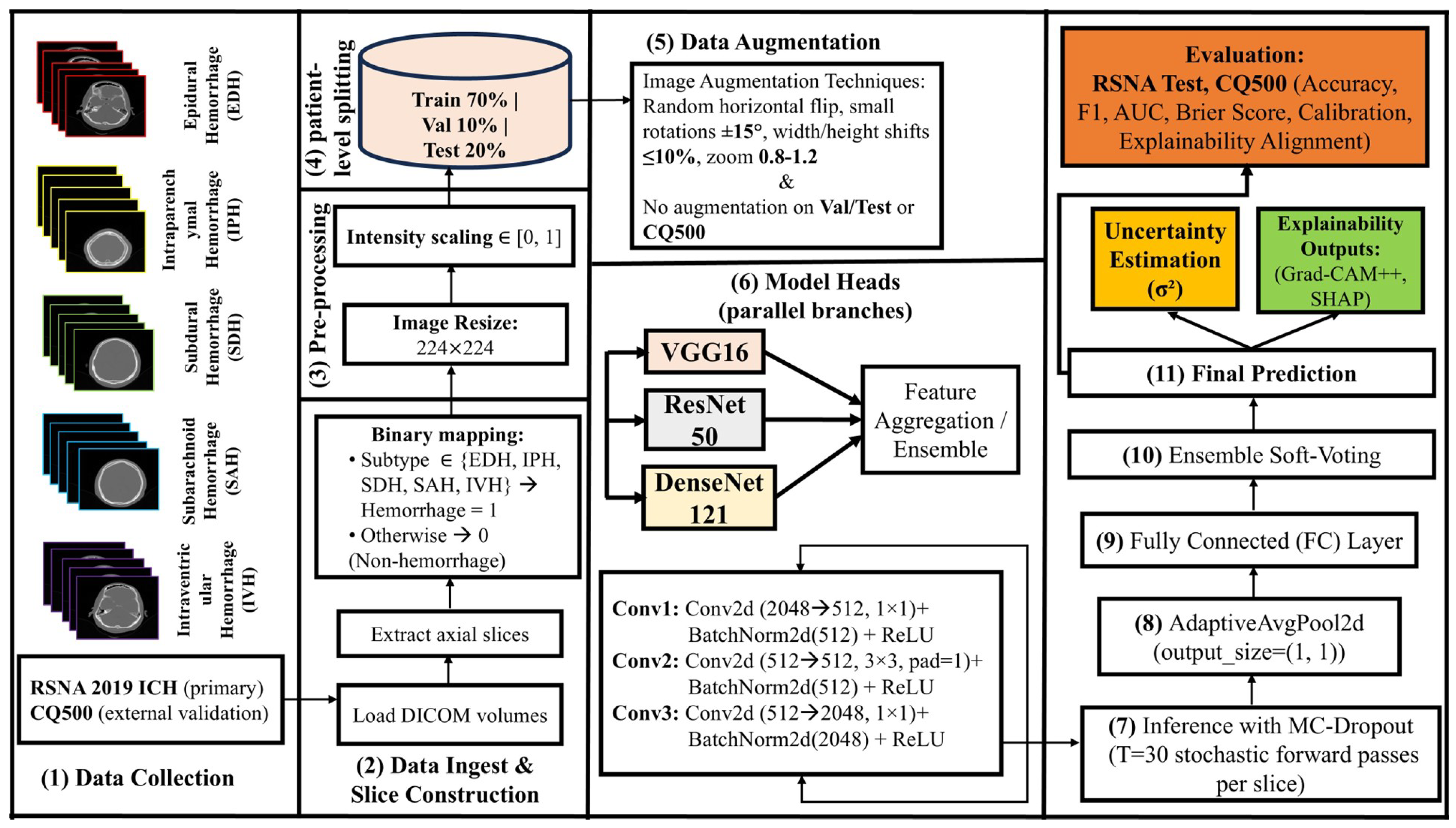 In contrast, X-HEM is designed as an integrated pipeline that (i) ensembles complementary CNN backbones, (ii) quantifies predictive uncertainty via Monte Carlo Dropout with calibration analysis, and (iii) combines Grad-CAM++ and SHAP with ROI-based evaluation. This unified design targets binary ICH detection while still leveraging subtype labels for analysis, aiming to provide predictions that are not only accurate but also confidence-aware and clinically interpretable.