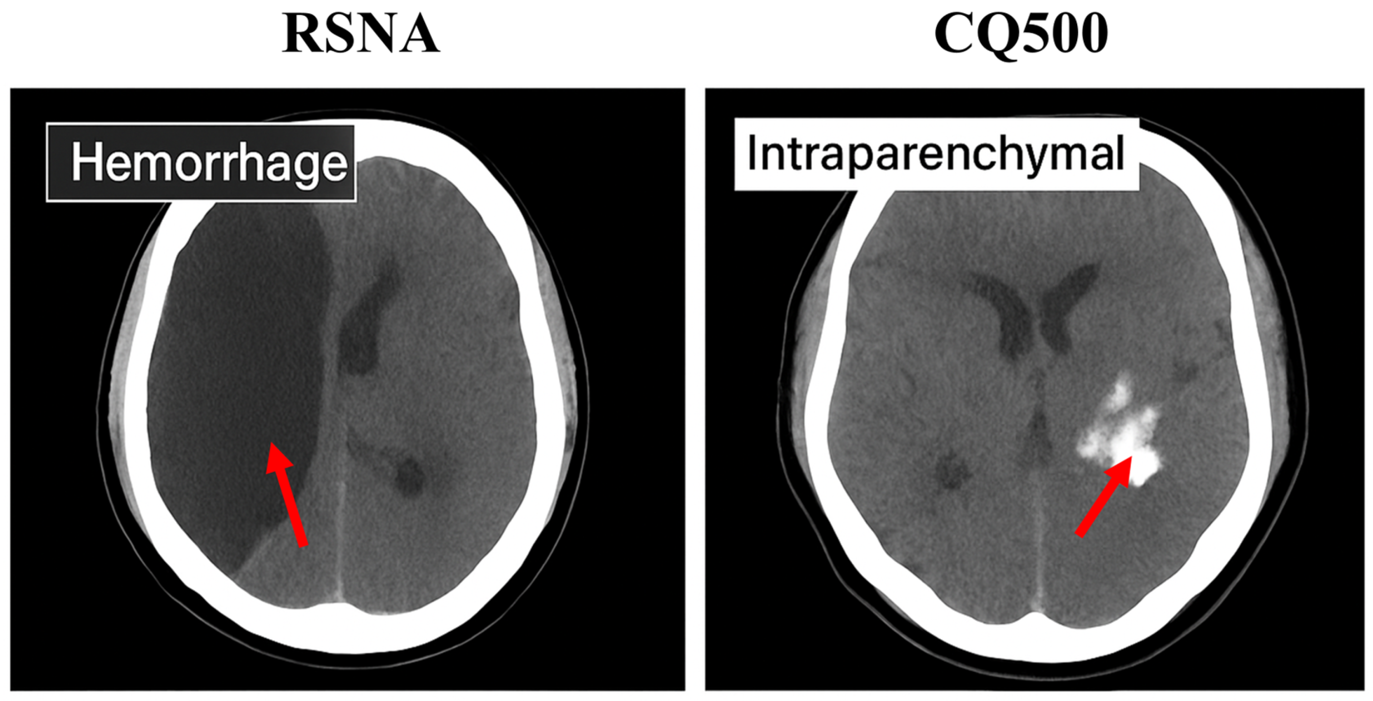 29] contains 491 CT studies from multiple hospitals in India. Each study was independently reviewed by three radiologists, with consensus labels assigned for ICH presence and subtype. Unlike RSNA, CQ500 provides a diverse clinical context and imaging variability, making it an ideal benchmark for external validation.