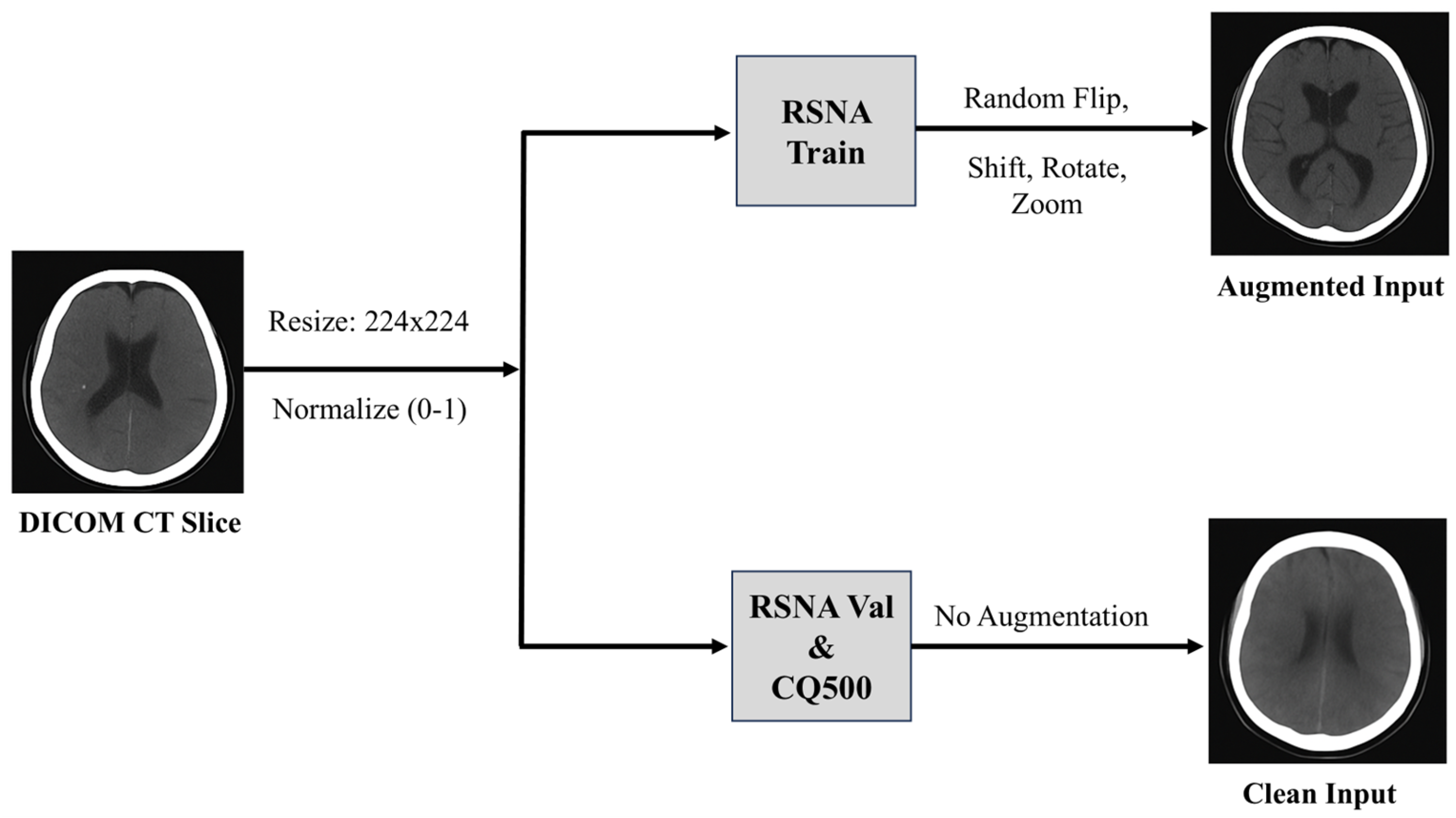 Figure 3 shows the preprocessing pipeline, where each DICOM slice is resized and normalized before augmentation. After preprocessing, RSNA contained approximately 750,000 standardized slices, and CQ500 contained approximately 25,000 slices (30–60 per study). CQ500 was reserved exclusively for external validation.