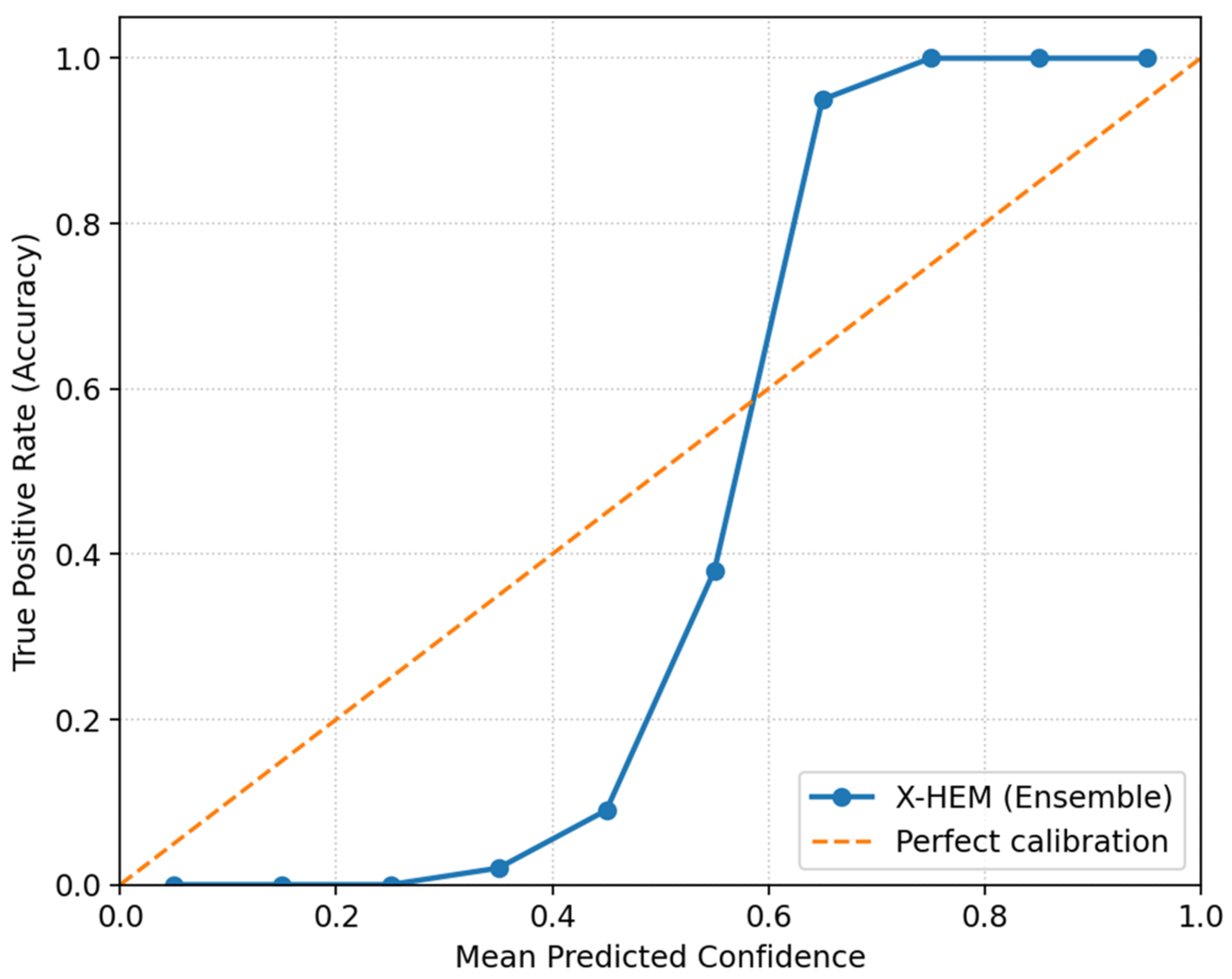 Table 9 further summarizes the calibration results of individual CNNs and the ensemble. The X-HEM ensemble outperformed all baselines, achieving the lowest Brier Score, ECE, and MCE across variance thresholds. At variance