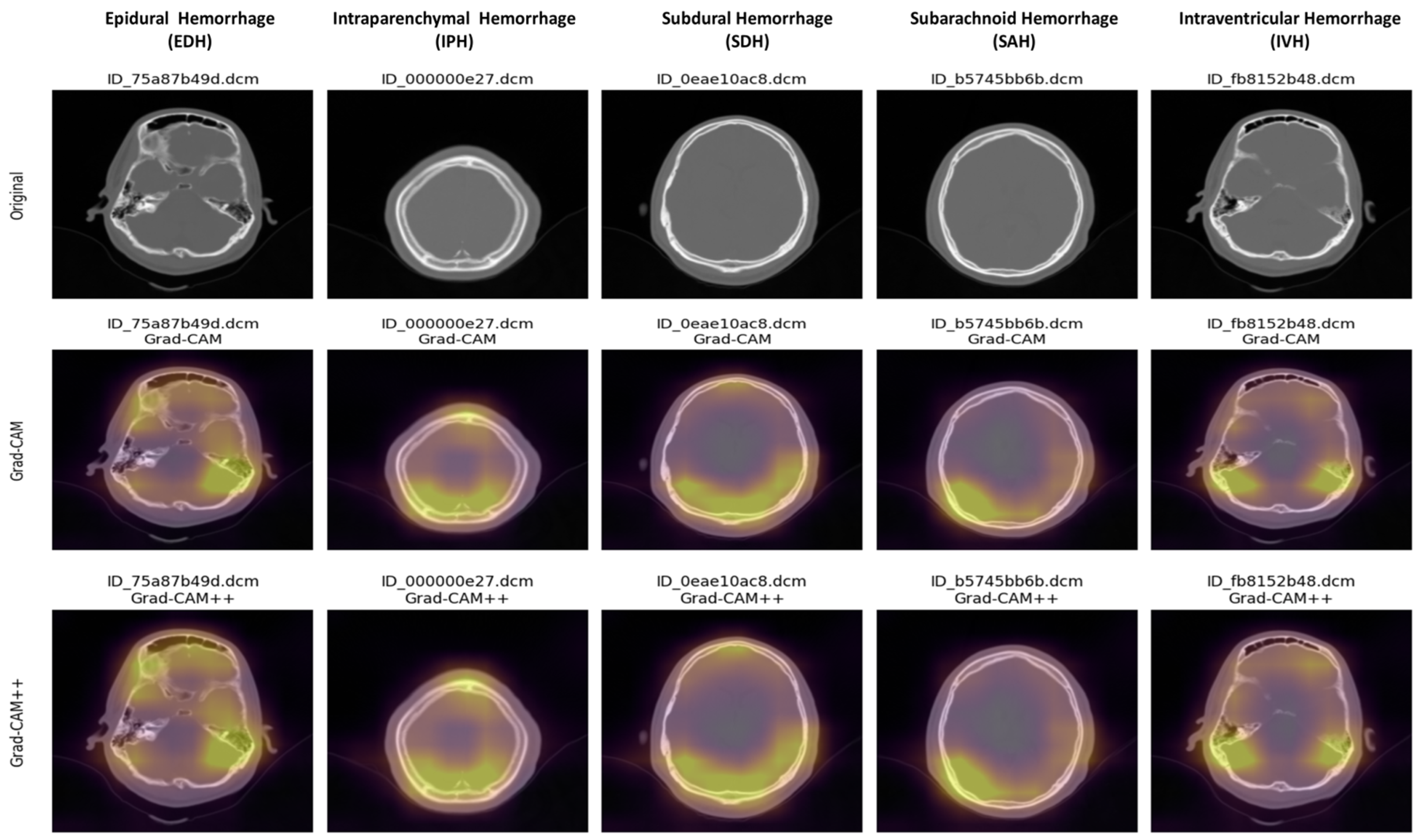 Figure 7 illustrates a qualitative comparison between Grad-CAM and Grad-CAM++ overlays on representative CT slices across five major ICH subtypes: Epidural (EDH), Intraparenchymal (IPH), Subdural (SDH), Subarachnoid (SAH) and Intraventricular (IVH). Grad-CAM overlays highlight broader regions of interest but often extend into surrounding non-hemorrhagic structures, limiting precision. In contrast, Grad-CAM++ produces sharper, more localized activations that closely align with radiologically visible hyperdense hemorrhage regions. For example, in epidural and intraventricular hemorrhage, Grad-CAM++ sharply delineates the high-density lesions, while in subarachnoid and subdural hemorrhage, it avoids unnecessary activations outside the sulci and cortical boundaries. These results demonstrate that Grad-CAM++ improves localization over Grad-CAM and also provides subtype-specific interpretability.