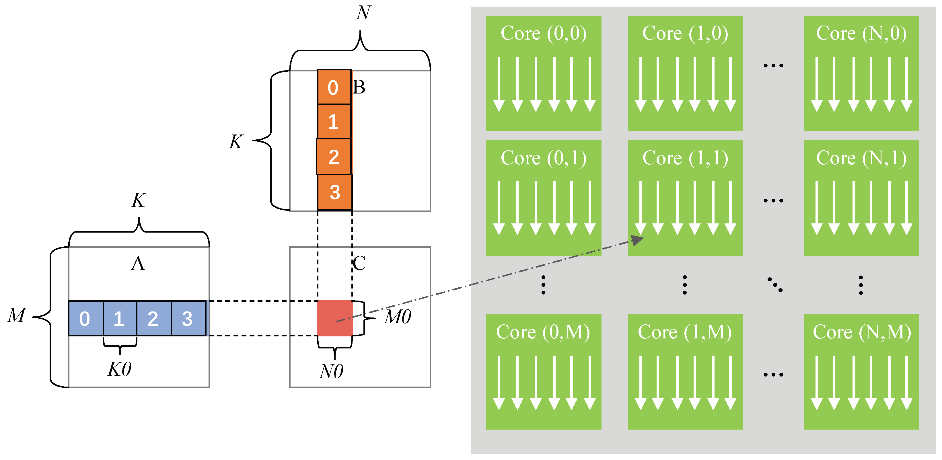 - Determine and selectable as listed in Table 1, where the corresponding index_mn must not exceed index_mn_max which is obtained from popped , and put all available combination of and into priority queue B where smaller and combination is given higher priority. This is to ensure that each block for both input and output matrices does not overflow from L0A, L0B, and L0C buffers.
