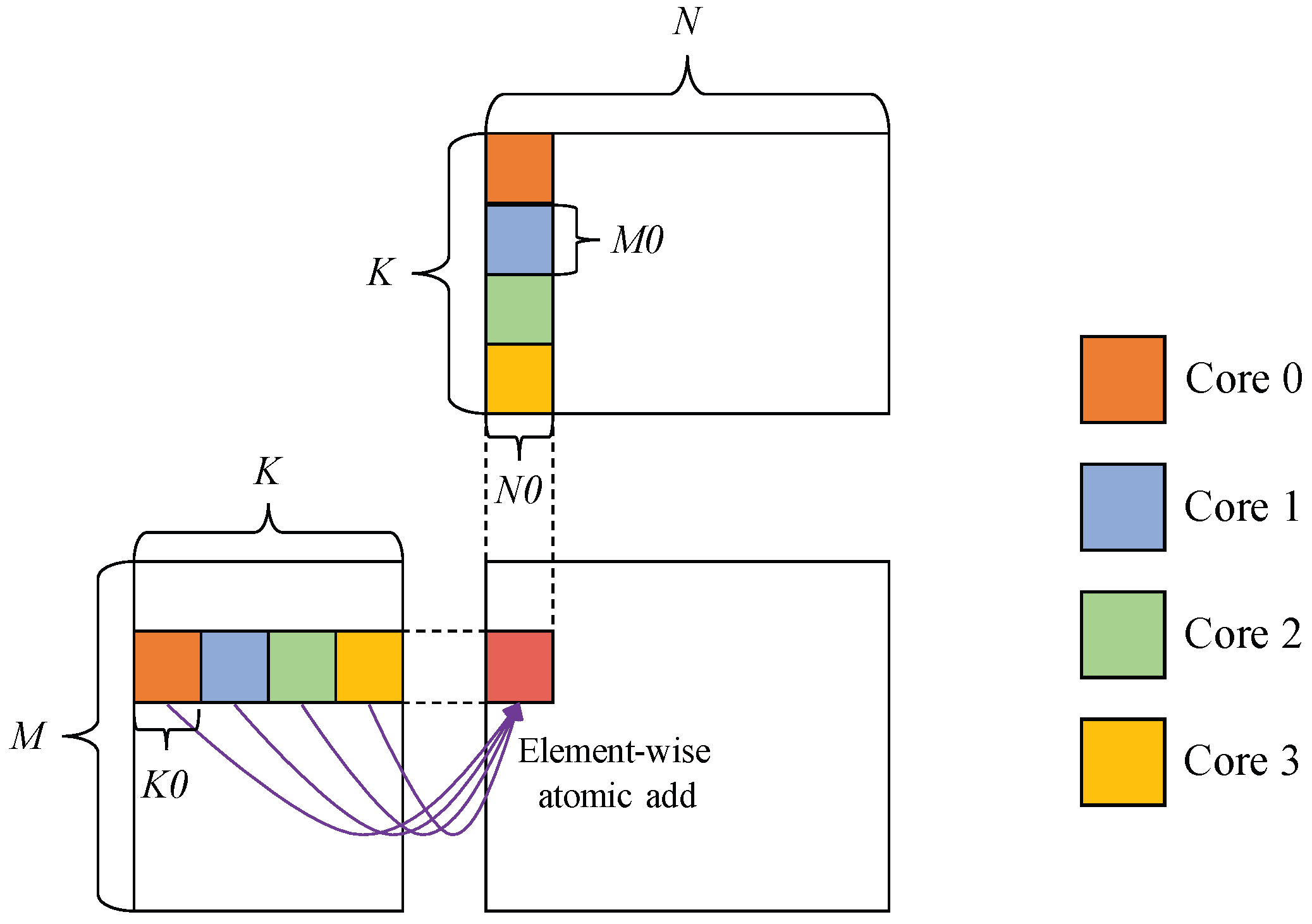 - Self-Adaptive Tiling Design. A suite of tiling strategies along with a corresponding strategy selection mechanism is proposed to determine the optimal tiling strategy for each specific matrix size. This mechanism balances the reduction in accumulation loops in the K direction and the maximization of hardware utilization in the M and N directions. Such an approach is also applicable to other SPMD-based GPU, NPU, or TPU architectures aiming to exploit hardware capabilities.