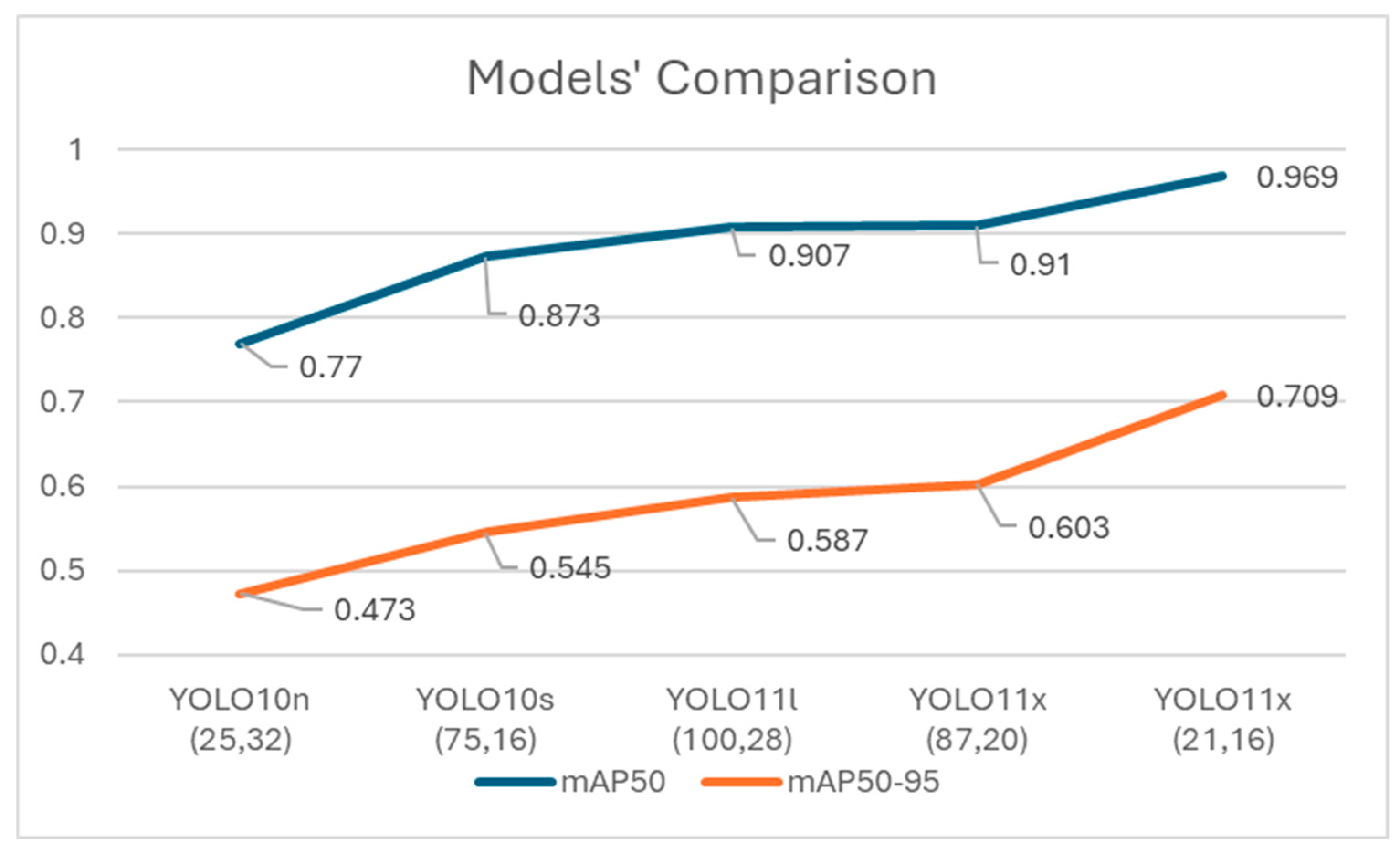 Table 4 presents the results of each model, including the optimizer and other hyperparameters employed to achieve the results of this study. The hyperparameters for each model have been optimized, and the results have been obtained. As demonstrated, YOLO11x obtained the best results in terms of mAP50 and mAP50-95 at a batch size of 16 and with 21 epochs using NAdam optimizer and learning rate 0.00001, as 96.9% and 70.9%, respectively, followed by the same model with batch sizes of 20 and 87 epochs at 91% and 60.3%, respectively. It can be deduced that the batch size plays a critical role in relation to epochs, while other parameters remain the same.
