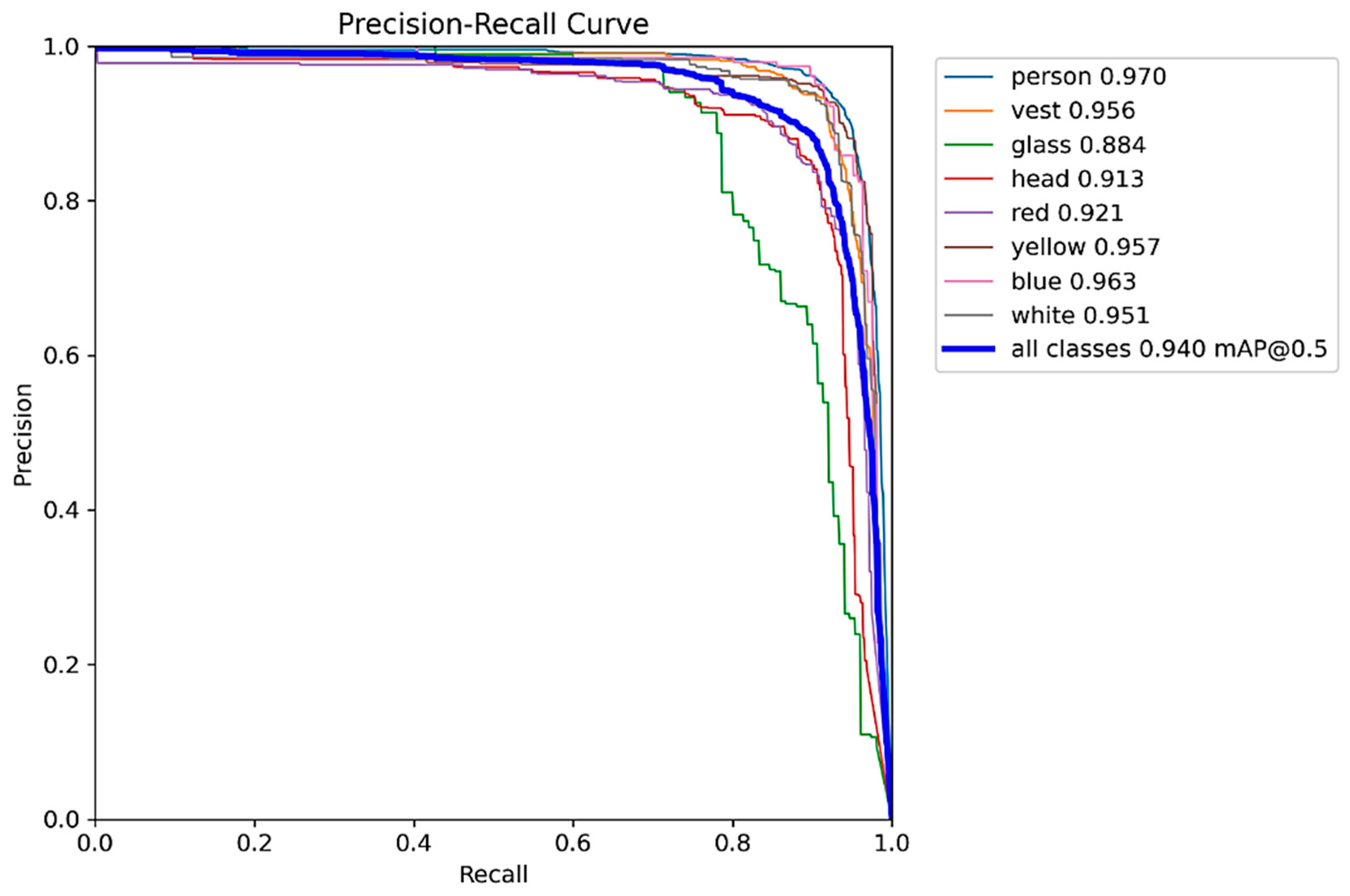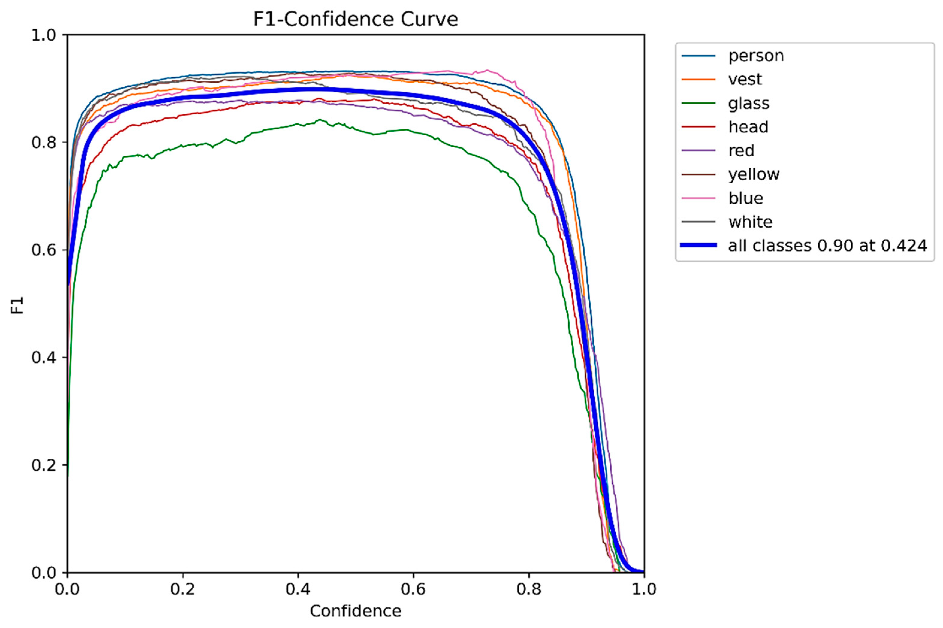 Figure 2. The person class obtained the highest confidence, while the glass class received the lowest confidence. The best model achieved an F1-score of 0.90 at a confidence threshold of 0.424. This score represents a good trade-off between precision and recall, and the figure illustrates the model’s performance at various confidence levels.
