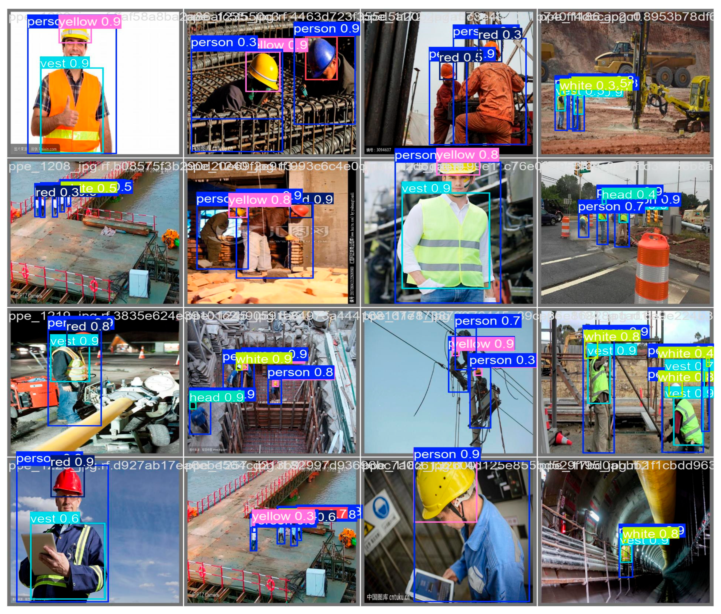 6]. The study used YOLOv3, YOLOv4, and YOLOv7. The dataset used is a custom dataset created by the study’s developers, containing images sourced from the web and from cameras. The augmented dataset comprises 11,000 images and 88,725 labels of PPE from various construction areas. The study categorized workers into four classifications: no hat, hat, no high-visibility vest, and high-visibility vest. The study achieved mAP of 97%.