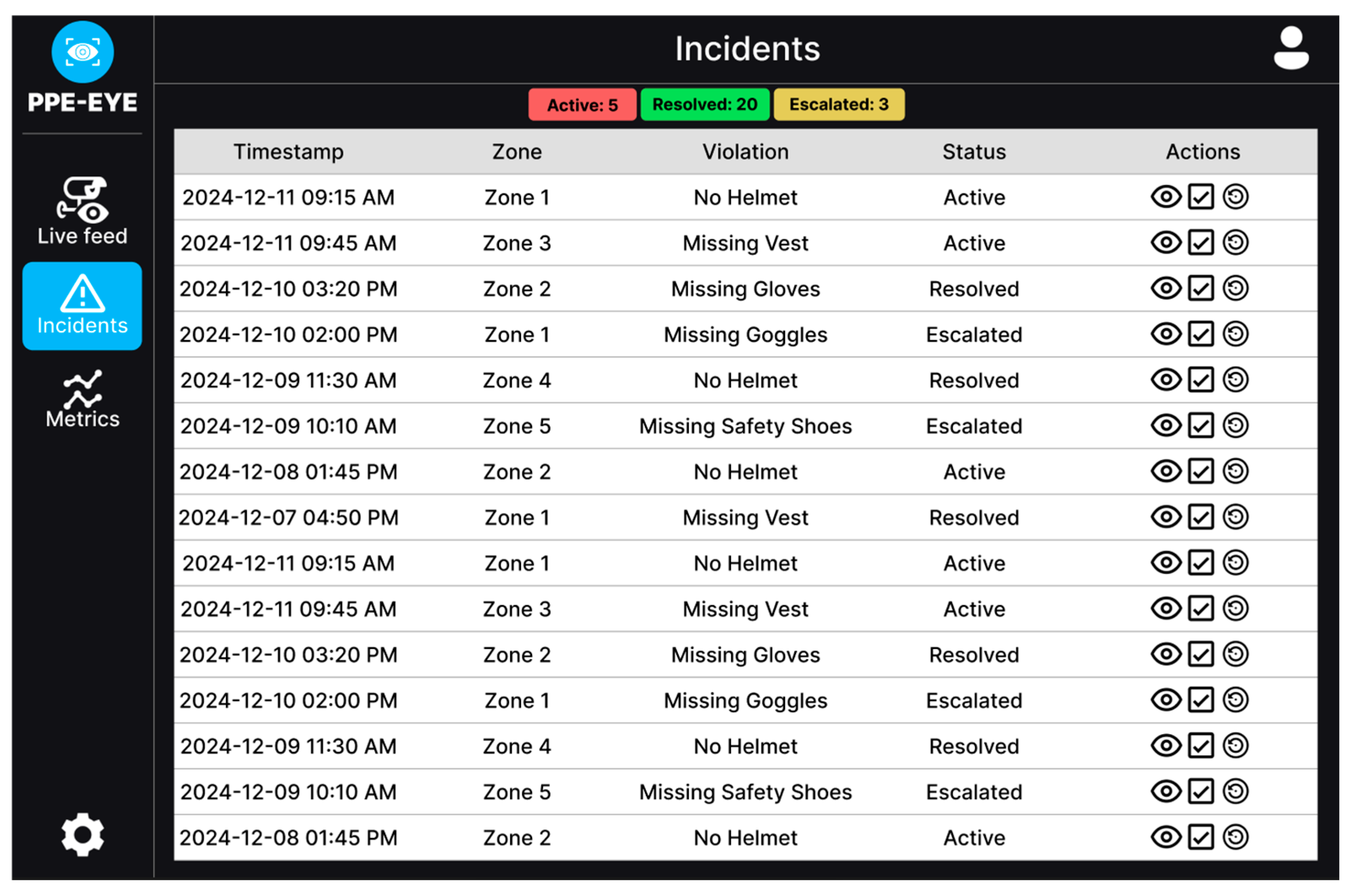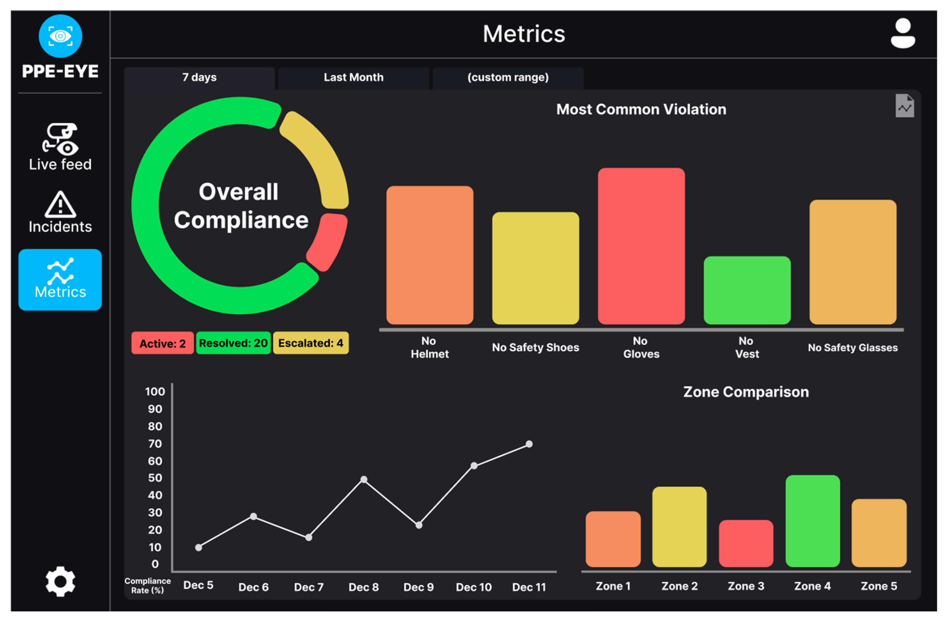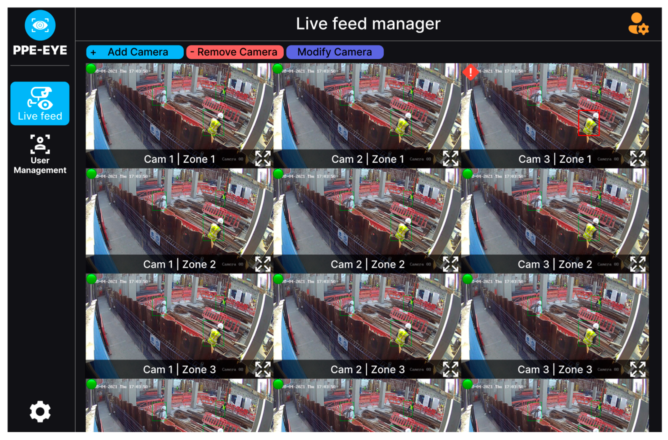 Figure 12 show the proposed PPE-EYE model deployed in a UI to show how the model can be deployed in real systems. The system used to detect all PPE classes trained on the model, but in the UI, there is only one bounding box, which indicates two things; the first one is when the bounding box is green, this means that there is no violation, and when the bounding box is red it means there is a violation and the alert will be sent to the incident section with more details about it (