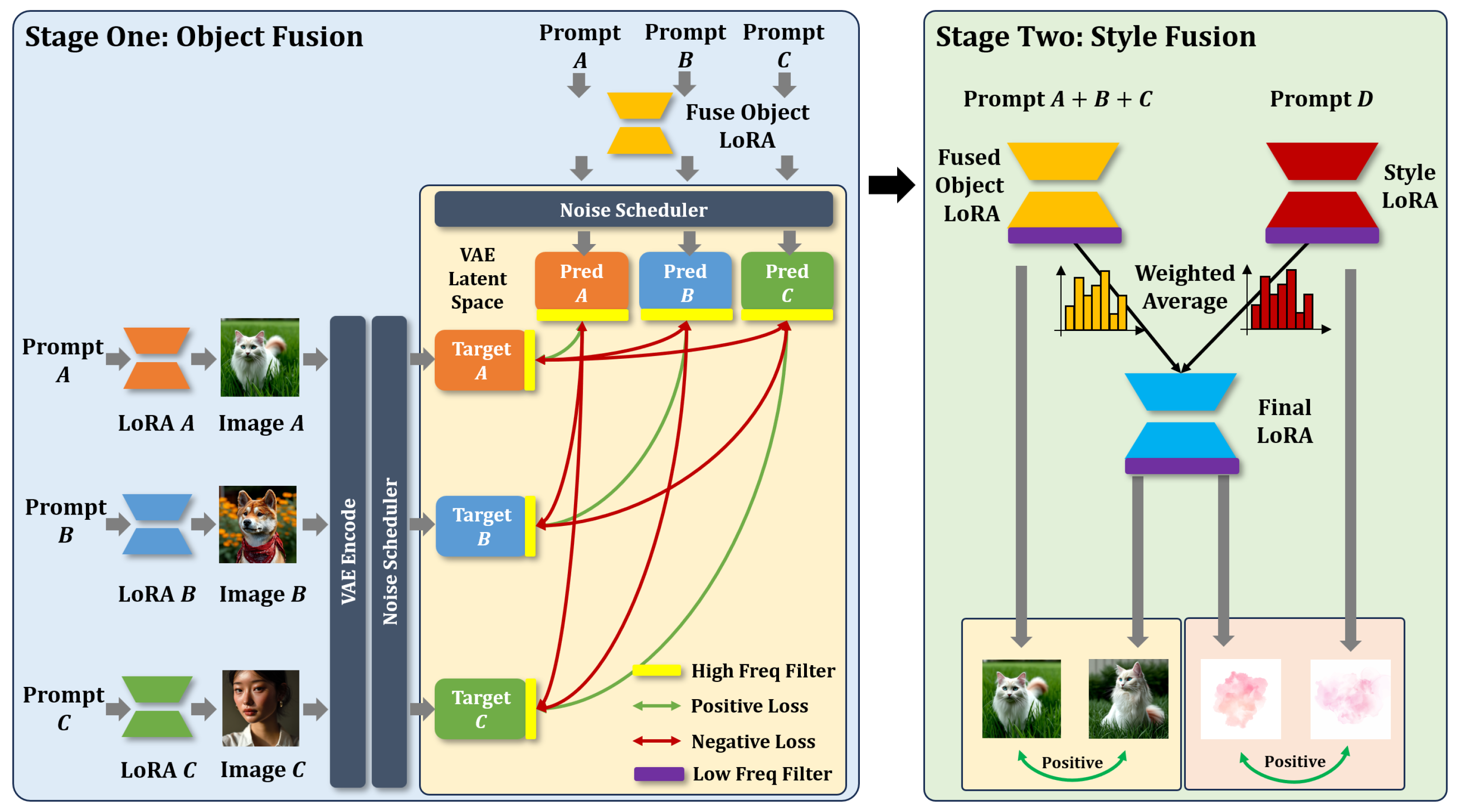 - We introduce ConWave-LoRA, a frequency-aware two-stage framework. Unlike prior works treating all parameters uniformly, we propose a DWT-based orthogonal filtering strategy to isolate high-frequency object details from low-frequency style attributes, effectively creating non-conflicting optimization subspaces for different concepts.