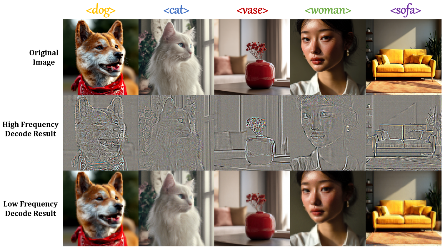 - We provide empirical validation of the frequency distribution assumption within the latent space (Section 4.2), visually and statistically confirming the mapping between frequency bands and semantic concepts.