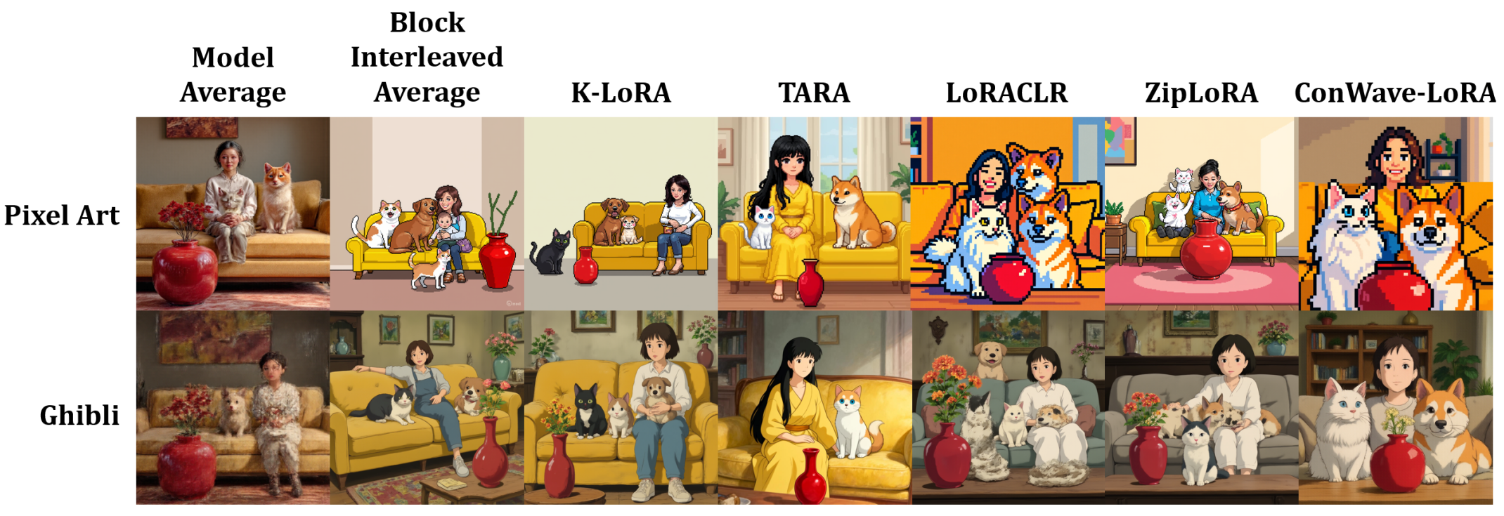 - Orthogonal Optimization Subspaces: Existing methods optimize a unified objective where gradients from object identity and artistic style are mixed, often leading to destructive interference (e.g., style textures overriding object edges). In contrast, ConWave-LoRA introduces a frequency-aware filtering strategy. By applying DWT, we theoretically project the optimization targets into orthogonal subspaces: high-frequency bands for structural identity and low-frequency bands for global style. This ensures that the gradient updates for style adaptation do not pollute the structural integrity of the object, a mechanism validated by our analysis in Section 4.2.