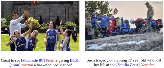 Targeted sentiment classification, also known as aspect-based sentiment classification, takes classical sentiment analysis to the level of specific targets in a sentence [1,2,3,4]. The goal is to assess whether feelings toward a given target are favorable, negative, or neutral. However, on social media, individuals frequently write short and casual sentences. These sentences can be ambiguous, and the text alone sometimes does not provide enough clues for accurate sentiment prediction. In many cases, the attached image brings additional emotional cues and can help the classifier make a better decision. As shown in Figure 1, the user’s feeling is often mainly expressed through the visual scene, while the text only hints at this feeling with a few words.