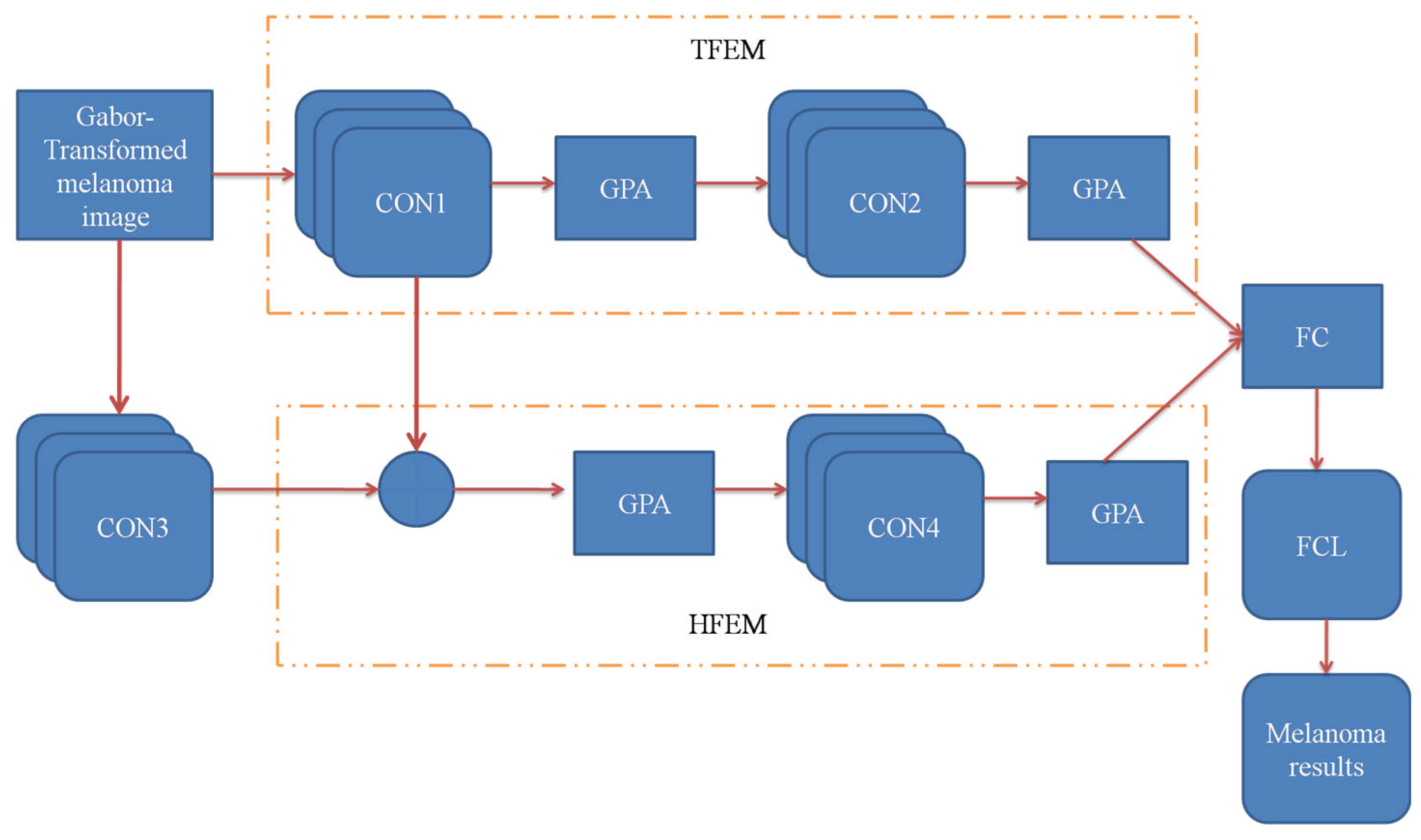 - The feature, constructed from a traditional CNN, is incorporated to classify dermoscopy skin images as melanoma or non-melanoma, using generated texture and higher-dimensional feature values from the sequence of internal layers.