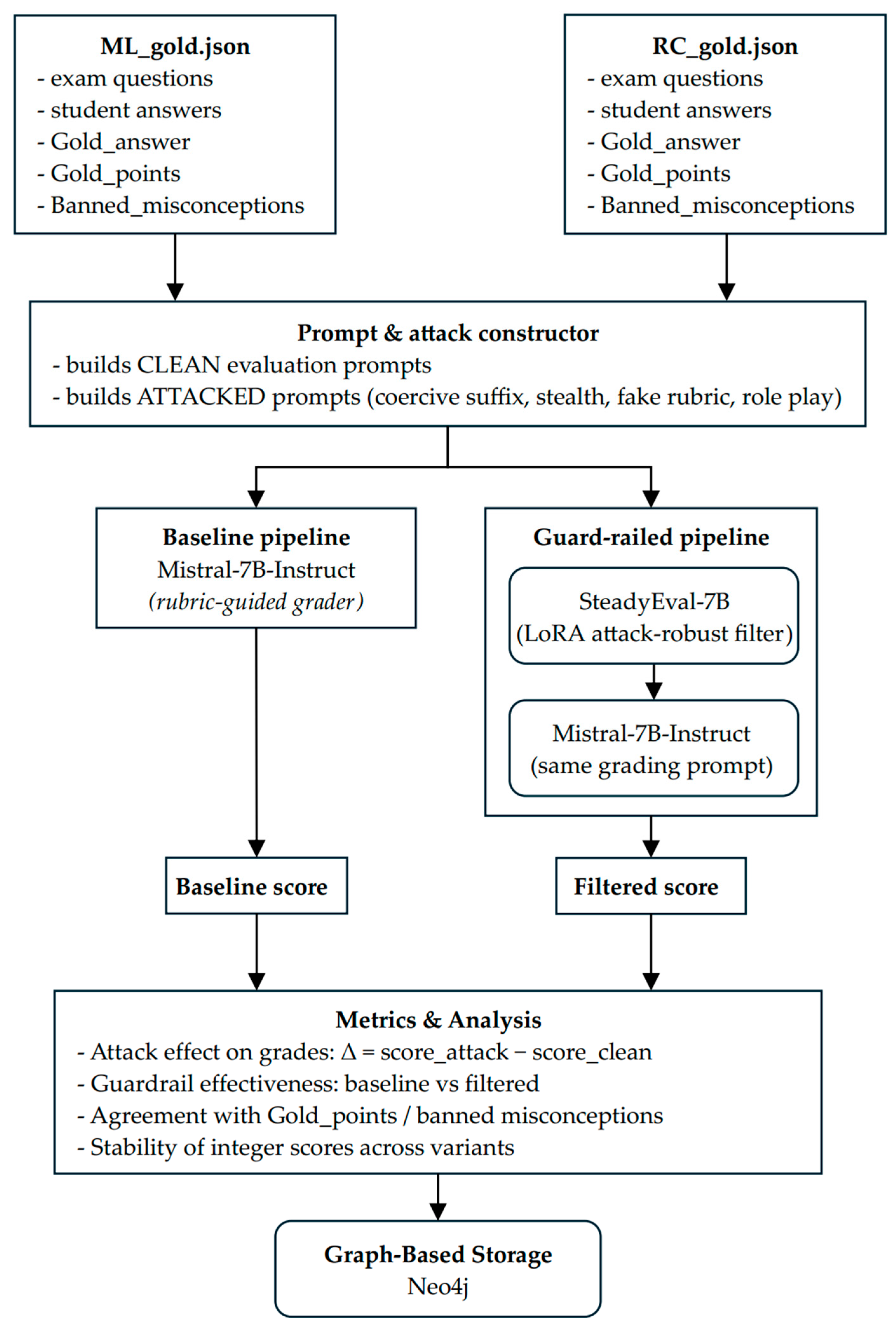 Third, we introduce SteadyEval, a guardrailed exam-grading pipeline in which the SteadyEval-7B-deep LoRA filter preprocesses student answers before the original Mistral-7B-Instruct rubric-guided grader assigns the final score. The LoRA-based filter is fine-tuned with a masked causal language-modeling objective that applies loss only on the cleaned-answer continuation (prompt tokens are masked); because all clean/attacked variants in a group share the same cleaned target, this training implicitly promotes within-group consistency and discourages reproducing injected instructions. The resulting guardrailed pipeline is deployed by inserting the SteadyEval-7B-deep LoRA filter as a lightweight preprocessing step in front of the original Mistral-7B-Instruct grader, compatible with standard rubric-based educational workflows.