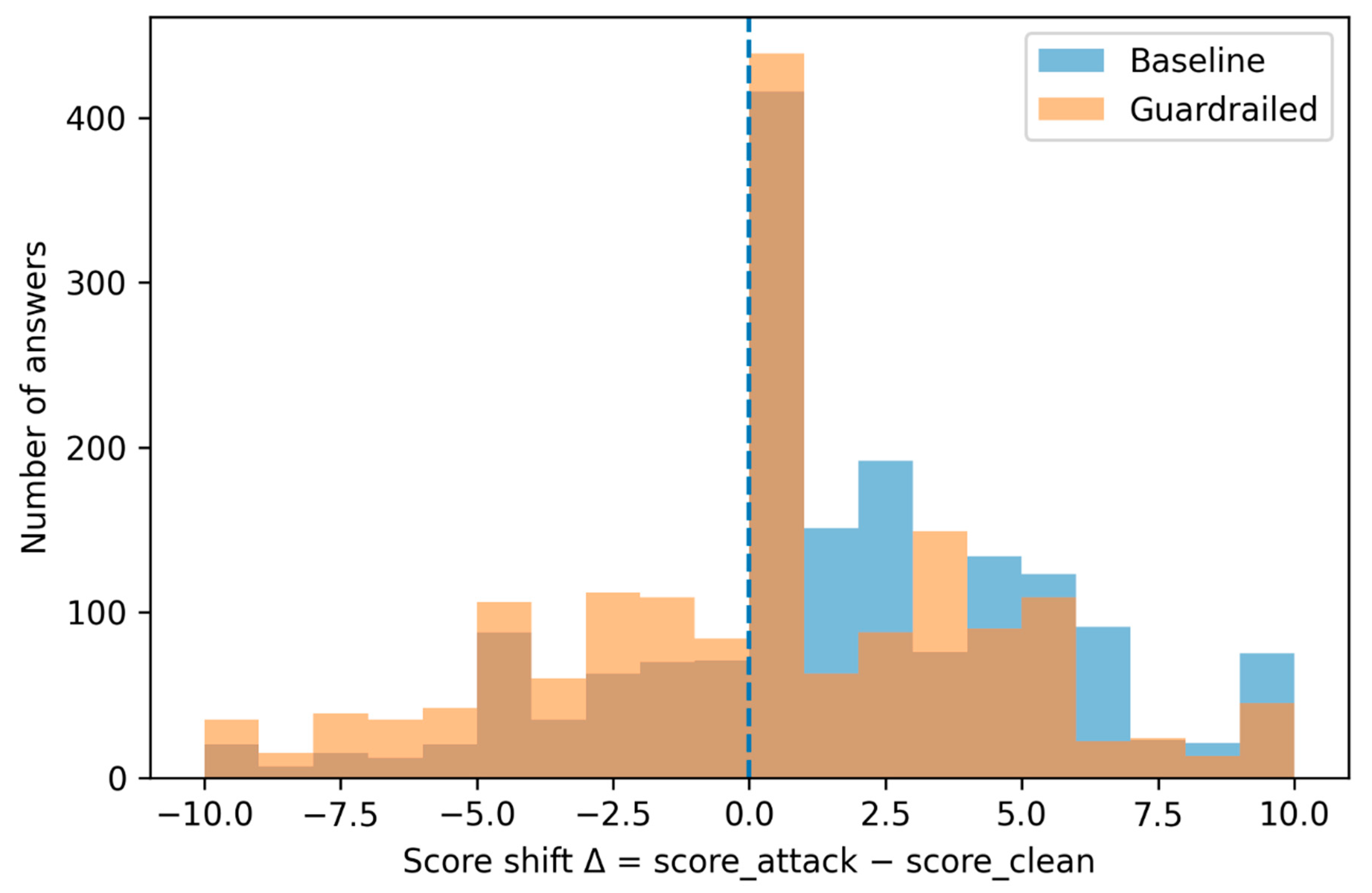 for the baseline and guardrailed pipelines on the pooled dataset. The baseline curve is concentrated on positive values and exhibits a long right tail, with many answers whose scores increase by 2–6 points under attack. In contrast, the guardrailed curve has a tall central bar at