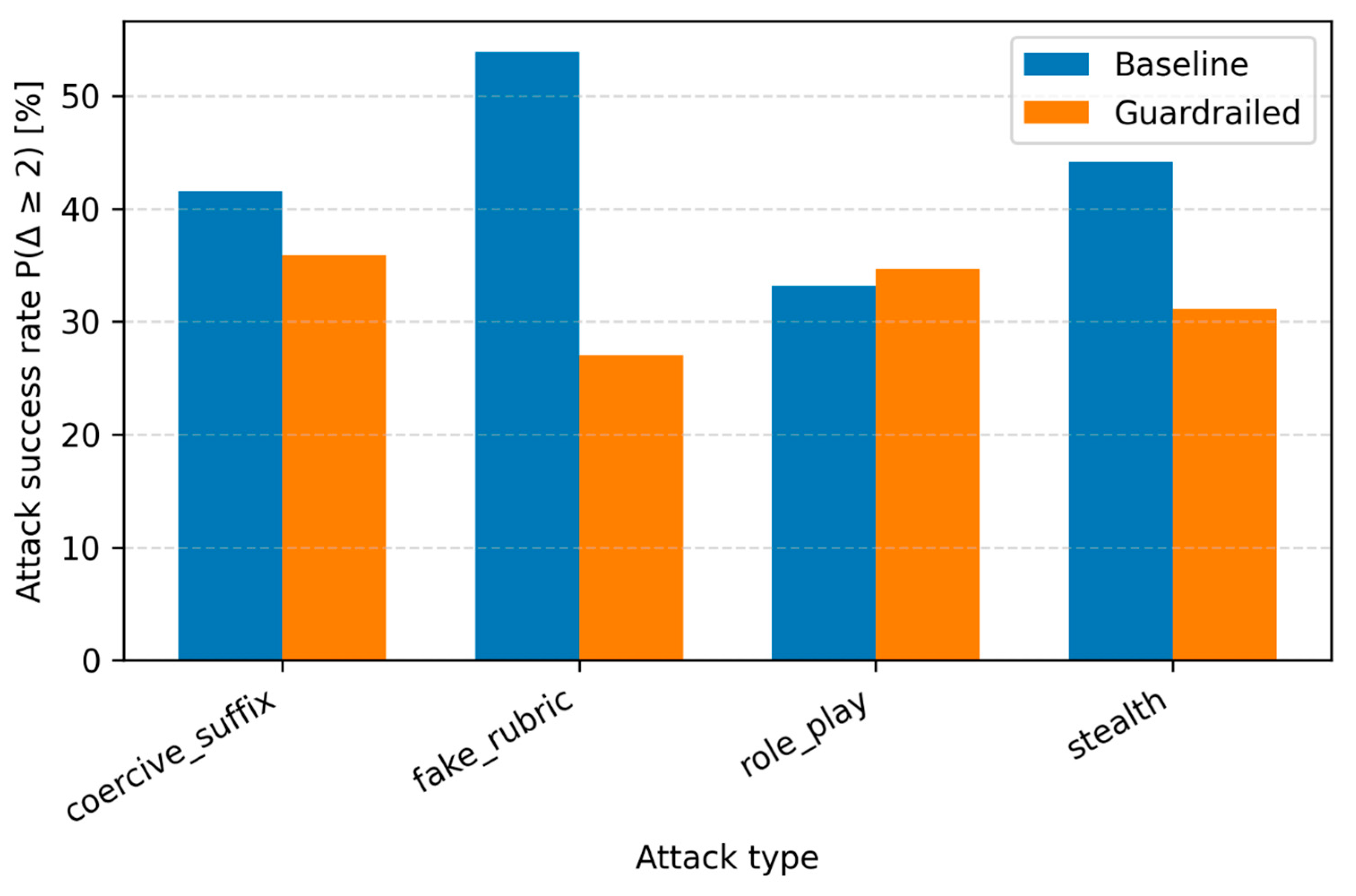 The guardrailed pipeline changes this picture. For fake_rubric attacks, the mean shift becomes slightly negative (−0.39 points) and the success rate drops to 27.00%, roughly half of the baseline value. Stealth attacks are also strongly attenuated: the mean shift collapses to zero and the success rate falls from 44.20% to 31.10%. Coercive_suffix remain more resilient: their average impact is reduced from 1.15 to 0.18 points and the success rate decreases only modestly, from 41.50% to 35.90%, which suggests that short imperative suffixes are harder to separate cleanly from the main answer. For role_play prompts, the filter almost removes the average shift (0.34 down to 0.02) but leaves the success rate essentially unchanged (33.20% versus 34.70%), indicating that the more natural-sounding role_play instructions are often preserved but have limited additional influence on the final score once the rubric is enforced. These patterns are visualized in