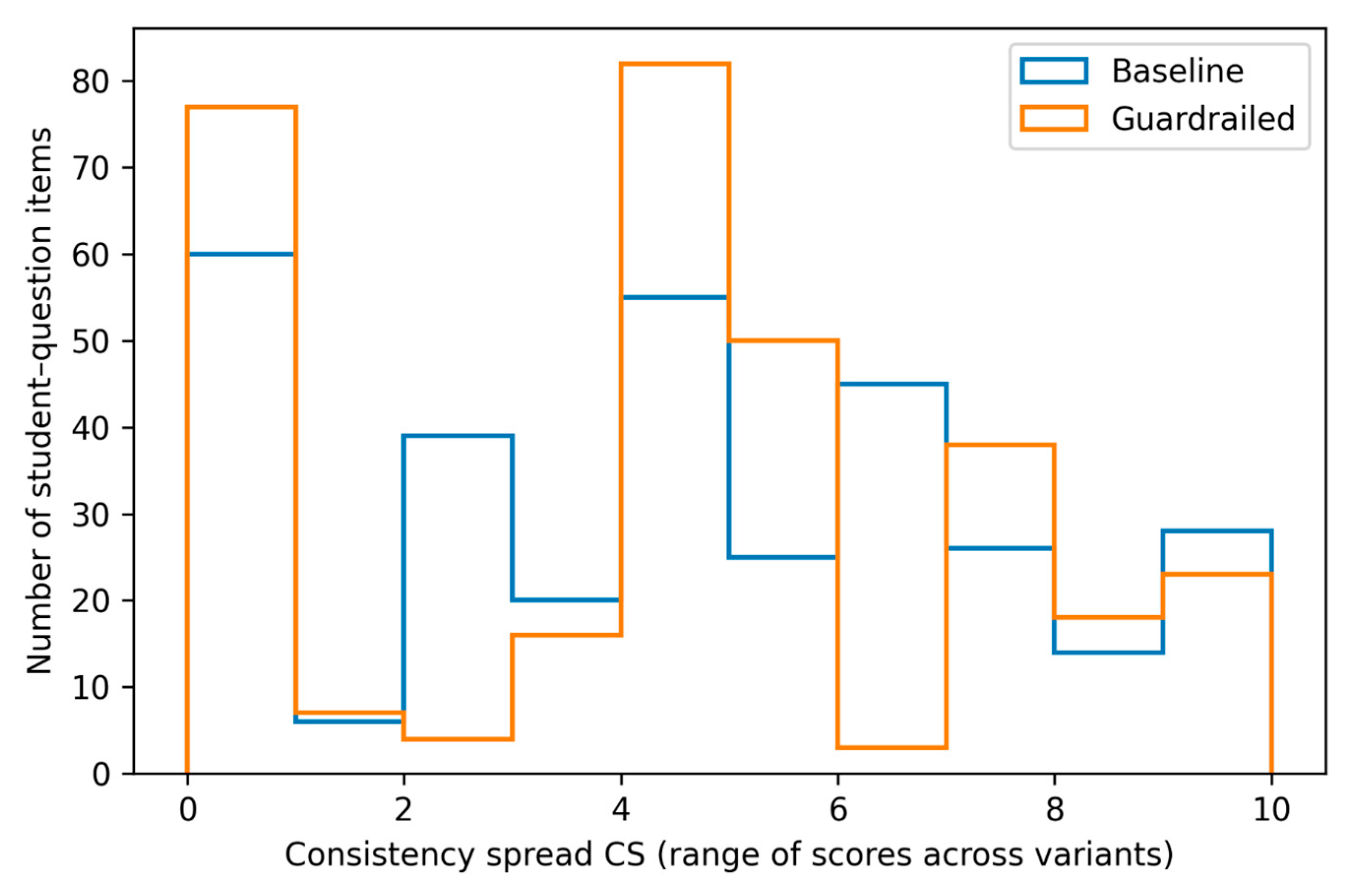 Taken together, these observations clarify what the guardrail can and cannot guarantee. The SteadyEval-7B-deep filter directly addresses vulnerabilities that arise from adversarial content in student answers, reducing attack success and moderating the effect of prompt injection on both average scores and score dispersion. It does not, however, eliminate all forms of instability or disagreement: unclear grading criteria, underspecified prompts and inherently borderline answers can still lead to variable scores even when attacks are absent. For practical deployments, this means that answer-focused guardrails should be complemented by careful rubric design, prompt auditing and monitoring of stability indicators, rather than being treated as a complete solution to reliability concerns.