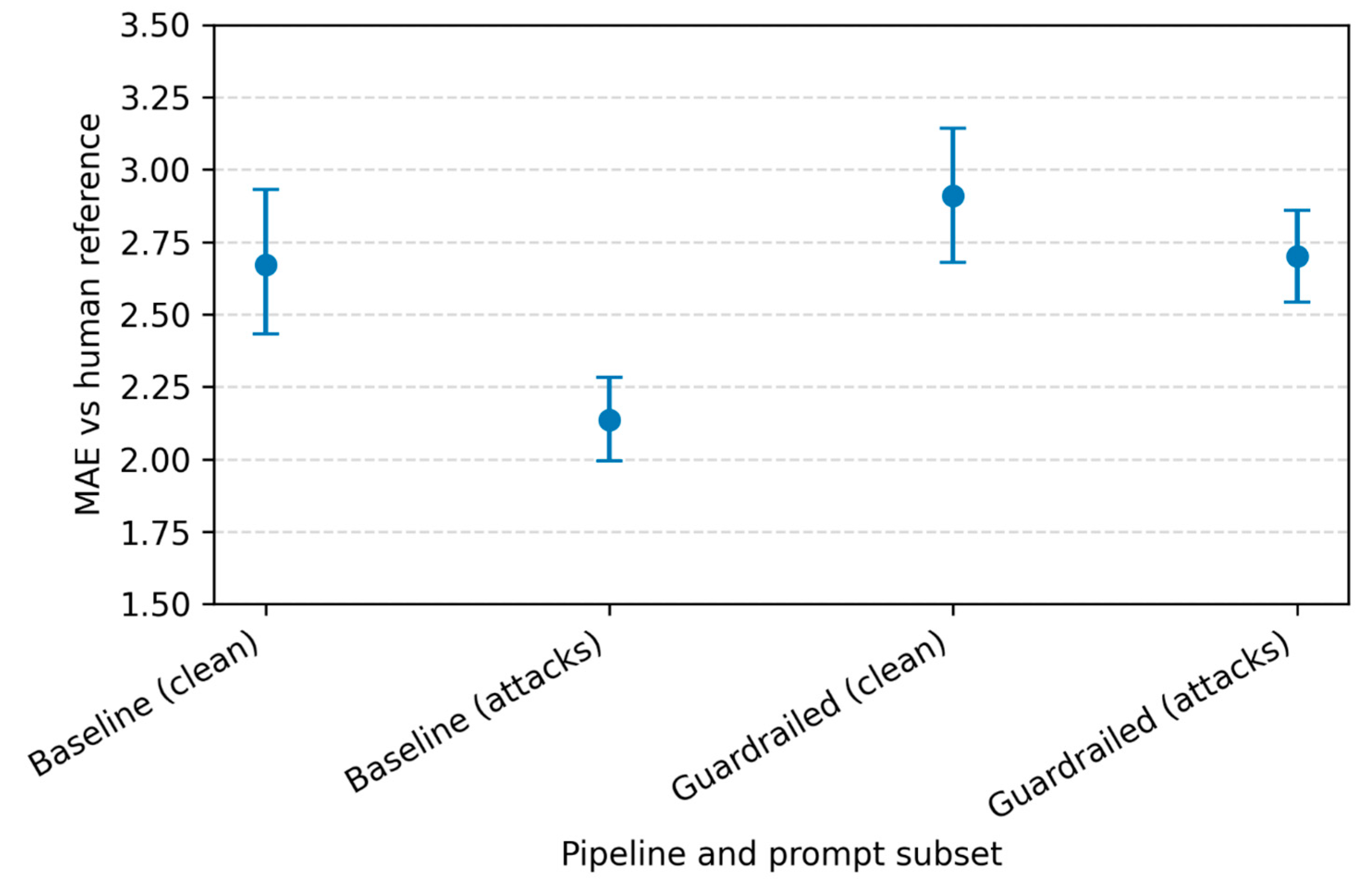 Figure 5, which shows the mean absolute error on the pooled dataset together with 95% bootstrap confidence intervals for each pipeline-subset combination. For clean prompts, the guardrailed pipeline has a slightly higher MAE than the baseline (around 2.9 versus 2.7), and the confidence intervals partly overlap, indicating a modest degradation in calibration. For attacked prompts, the difference is larger (around 2.7 versus 2.1) and the corresponding intervals barely overlap, suggesting a systematic increase in error once filtering is applied. Within the baseline pipeline, attacks yield a lower MAE than clean prompts, whereas in the guardrailed pipeline the MAE on clean and attacked prompts is similar and the uncertainty intervals largely overlap.