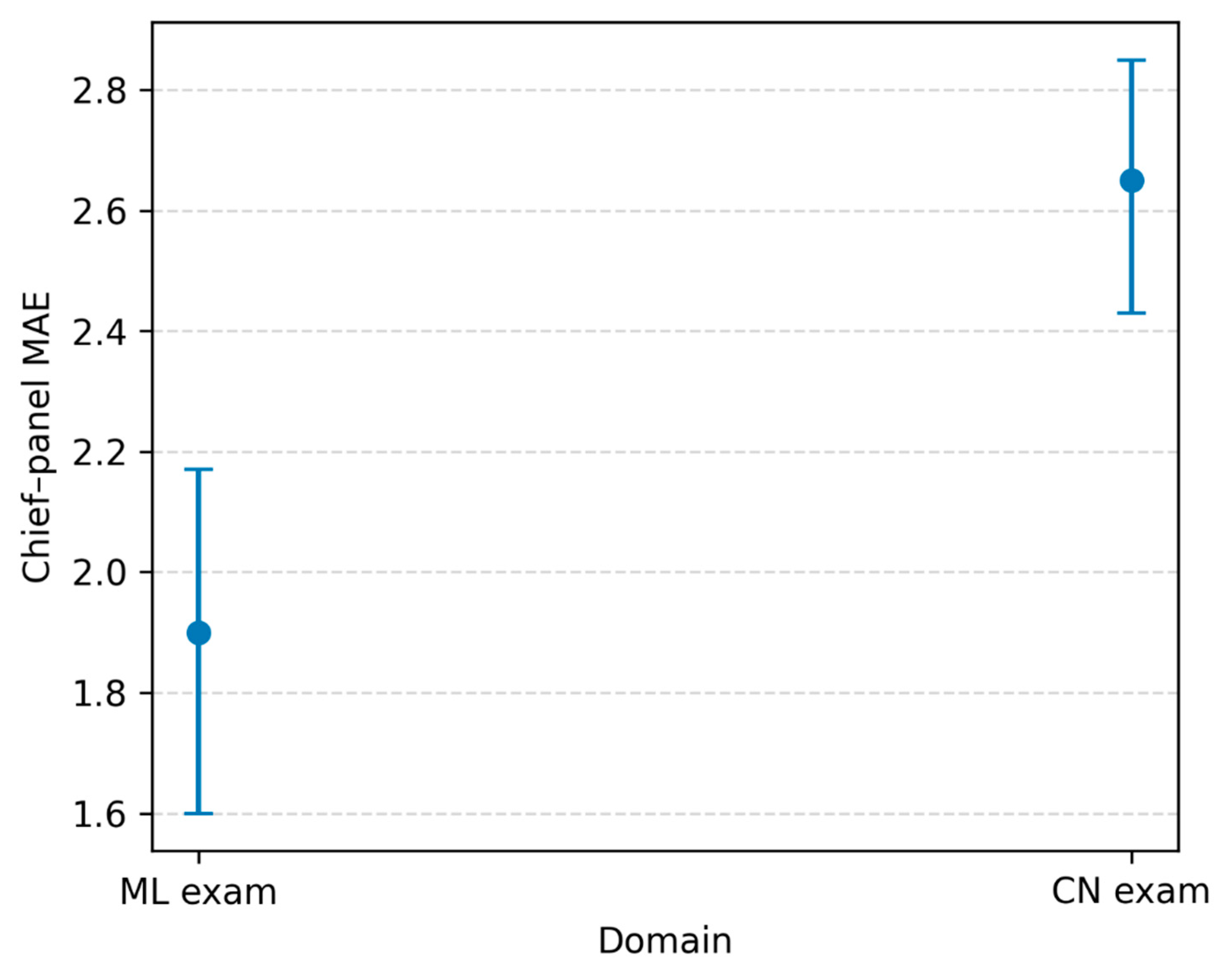 The guardrailed pipeline therefore operates alongside an effective panel of almost three graders per item. In the machine-learning exam, the chief-panel MAE is 1.90 points on the 1–10 scale, with a 95% confidence interval from 1.60 to 2.17 points, and the bias is −0.76 points. This indicates moderate disagreement with the panel but only a mild tendency to under-score relative to the average of the human raters and the baseline pipeline. In the networking exam, the chief-panel MAE increases to 2.65 points (95% CI [2.43, 2.85]), and the bias becomes much more negative at −2.21 points, meaning that the guardrailed pipeline systematically assigns grades more than two points below the panel. When pooling both exams, the chief-panel MAE is 2.38 points with a bias of −1.70, reflecting an overall under-grading tendency that is driven mainly by the networking domain. These differences are visualized in