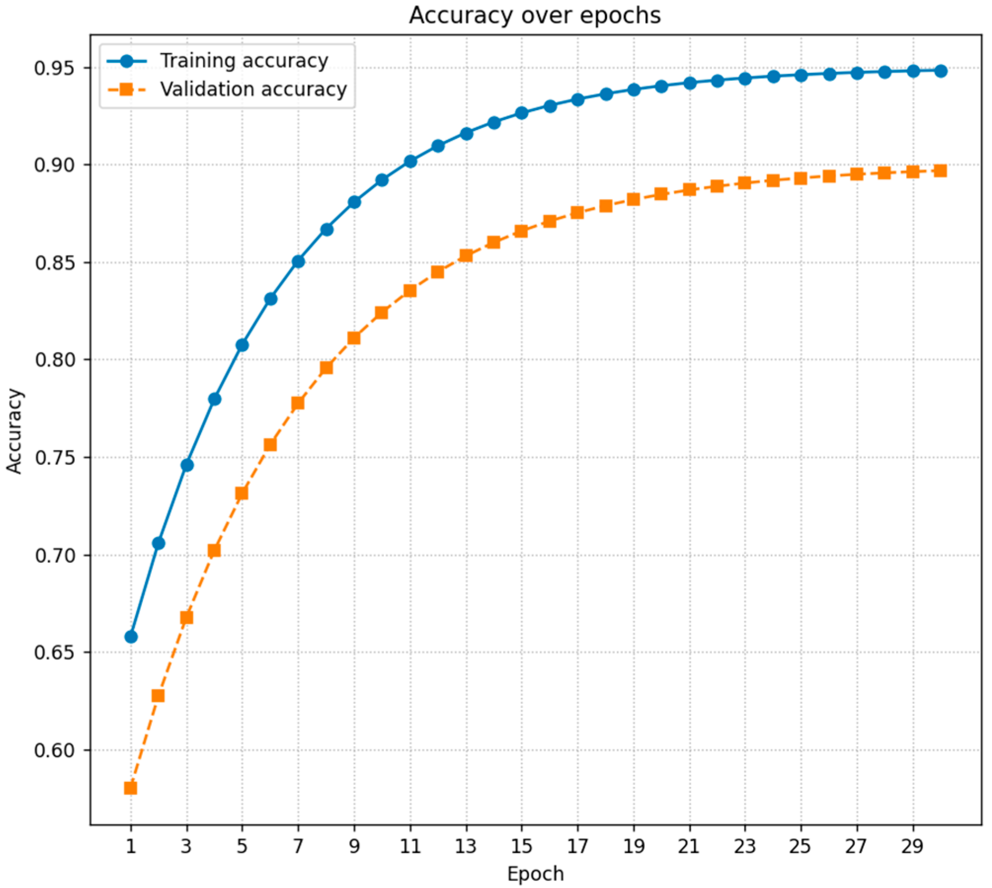 Figure 3, the validation accuracy follows the training accuracy closely and saturates after approximately 12 epochs, which suggests that the model converges without severe overfitting. In parallel,