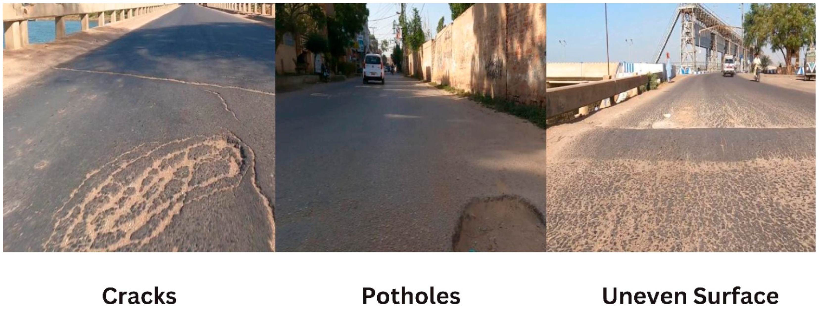 | 6. | Smartphone Camera | 2560 × 1440 | 3 | Potholes, Speed Bumps, Manholes | 1D-CNN, Sliding Window Algorithm | 91% Average Accuracy | [38] |