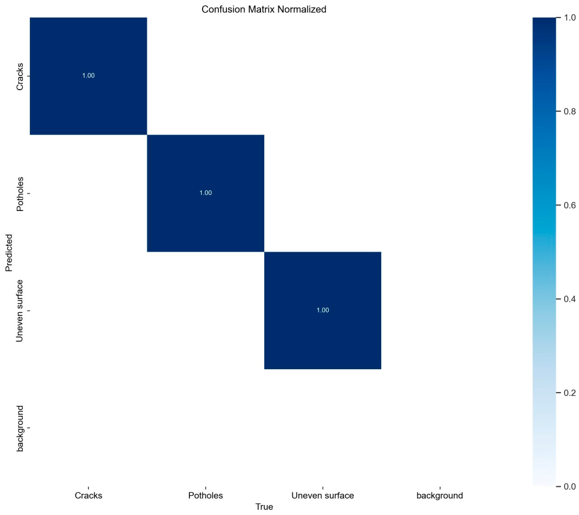 | 2. | Not explicitly mentioned | 587 × 1058 | 8 | Alligator Cracks, Longitudinal Cracks, Patching, Potholes, Raveling, Rutting, Shoving/Upheaval, Transverse Cracks | YOLOv8 | 28% Precision-Recall Score (at IoU 0.5), 31% F1-score | [34] |