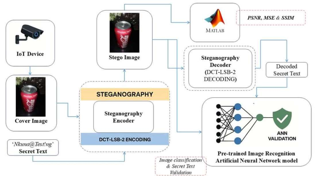 Contribution of this study: Image steganography embeds and hides data using techniques such as the least significant bit (LSB) insertion, which alters the least significant bit of pixel values to hide data [1,2]. The discrete cosine transform (DCT) enables embedding data in the frequency domain of the cover media, thereby making it more robust against compression [2]. Further to the DCT, the discrete wavelet transform (DWT) technique embeds data into different frequency bands, enabling multi-resolution analysis [3]. These embedding techniques will be used to conceal validation codes/metadata within the pixels of the IoT camera images, enabling forensic validation of the pictures and secure data transmission. An ANN model will be trained to recognize patterns and detect anomalies in the IoT device images. The incoming data from the smart camera device is compared against the learned patterns for anomaly detection and alteration. Through the use of the ANN model, only validated data is accepted; therefore, the method enhances the security of IoT camera systems.