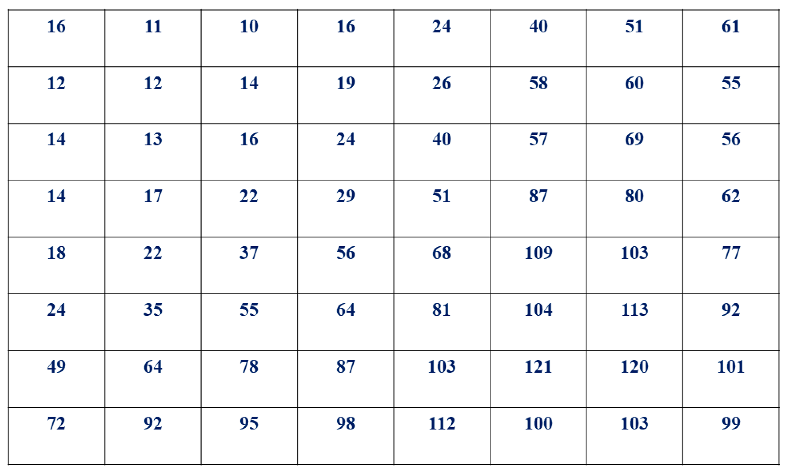 • Qpq is a luminance quantization matrix with 8 × 8 (64) elements, presented in Figure 1 below.
