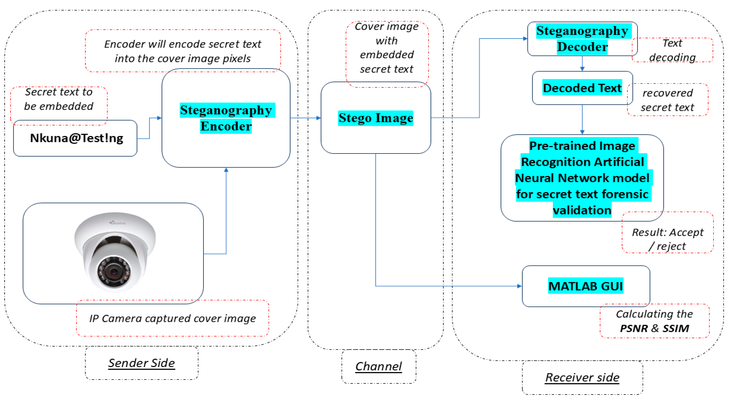Ref. [8] examines several steganographic techniques for safe data concealing. Some of the methods included are image steganography masking schemes, as well as the LSB-1, 2, and 3 methods. In study [9], researchers employed encrypted secret messages to determine an advanced steganography algorithm. At the encoding side, the encryption process includes a stego-key before embedding the data. This stego key ensures that, in the event of unauthorized interception, the attacker will not be able to decrypt the secret messages, thereby providing the confidentiality of the information. The study in [9] also focused more on imperceptibility aspects and did not include any elements of authenticity or data forensic validation on the receiver side. Neither of the novel studies in [8] and [9] integrated aspects of ANNs into the steganography methods they proposed, nor did they investigate the data forensic validation aspects. Hence, there is a need to explore the identified gap and develop more robust steganography systems.
