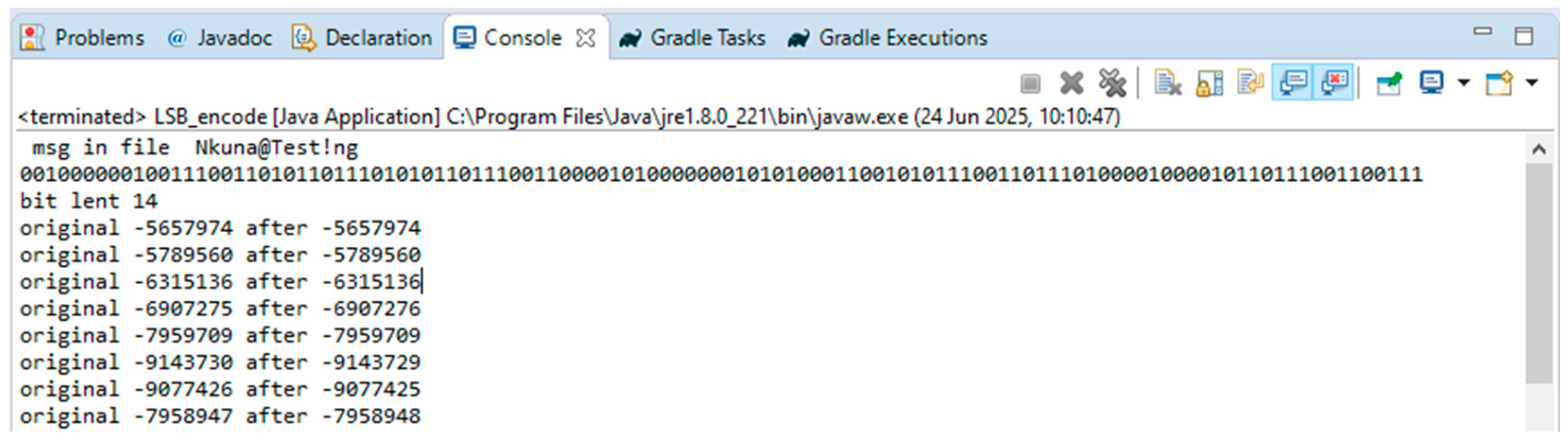 The encoding algorithm was executed, and the following Java console output is shown.