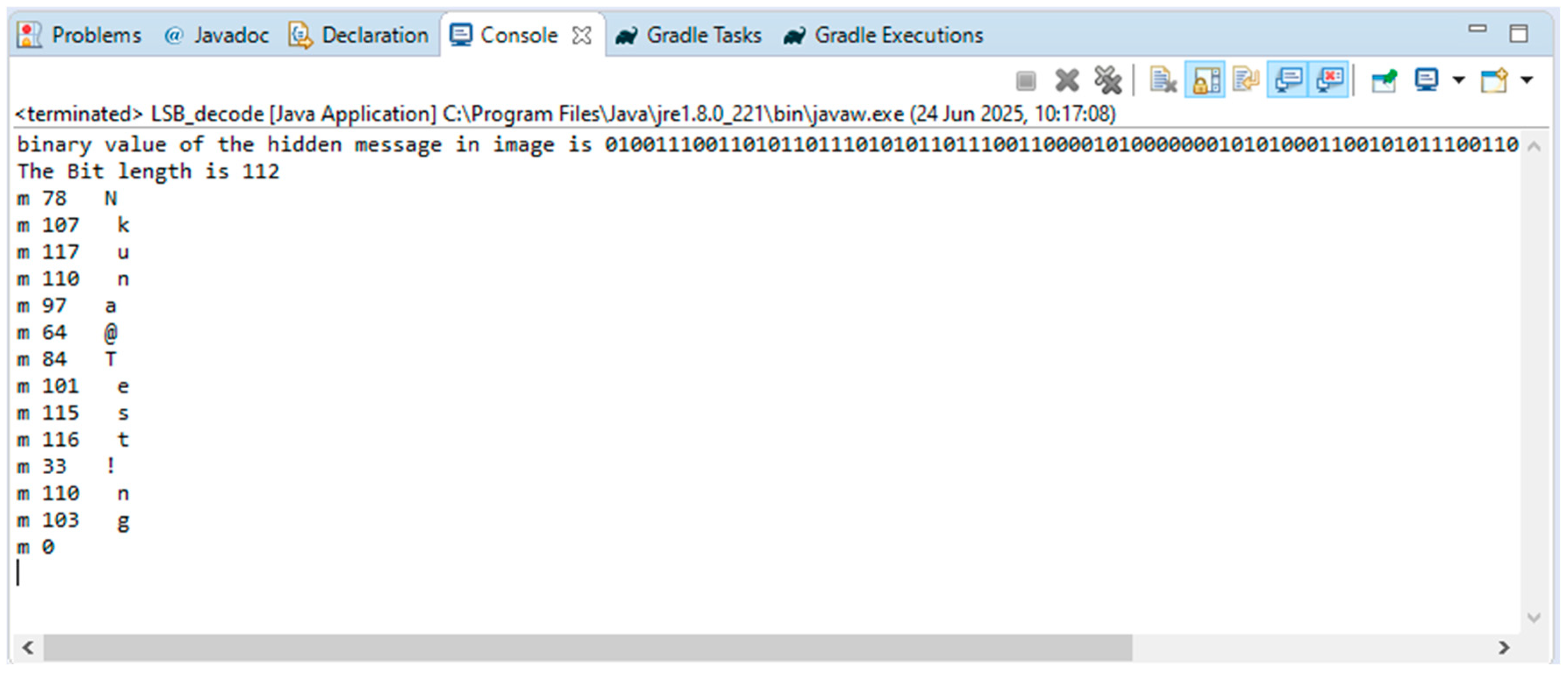 The decoding algorithm was also executed on the receiver side, and the following results were obtained from the Java console.