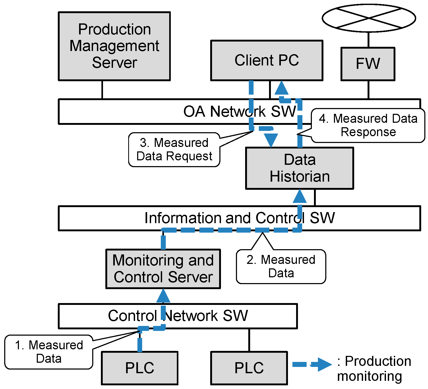| Production Control Server | Client PC | Data Historian | Monitoring and Control Server | PLC | |