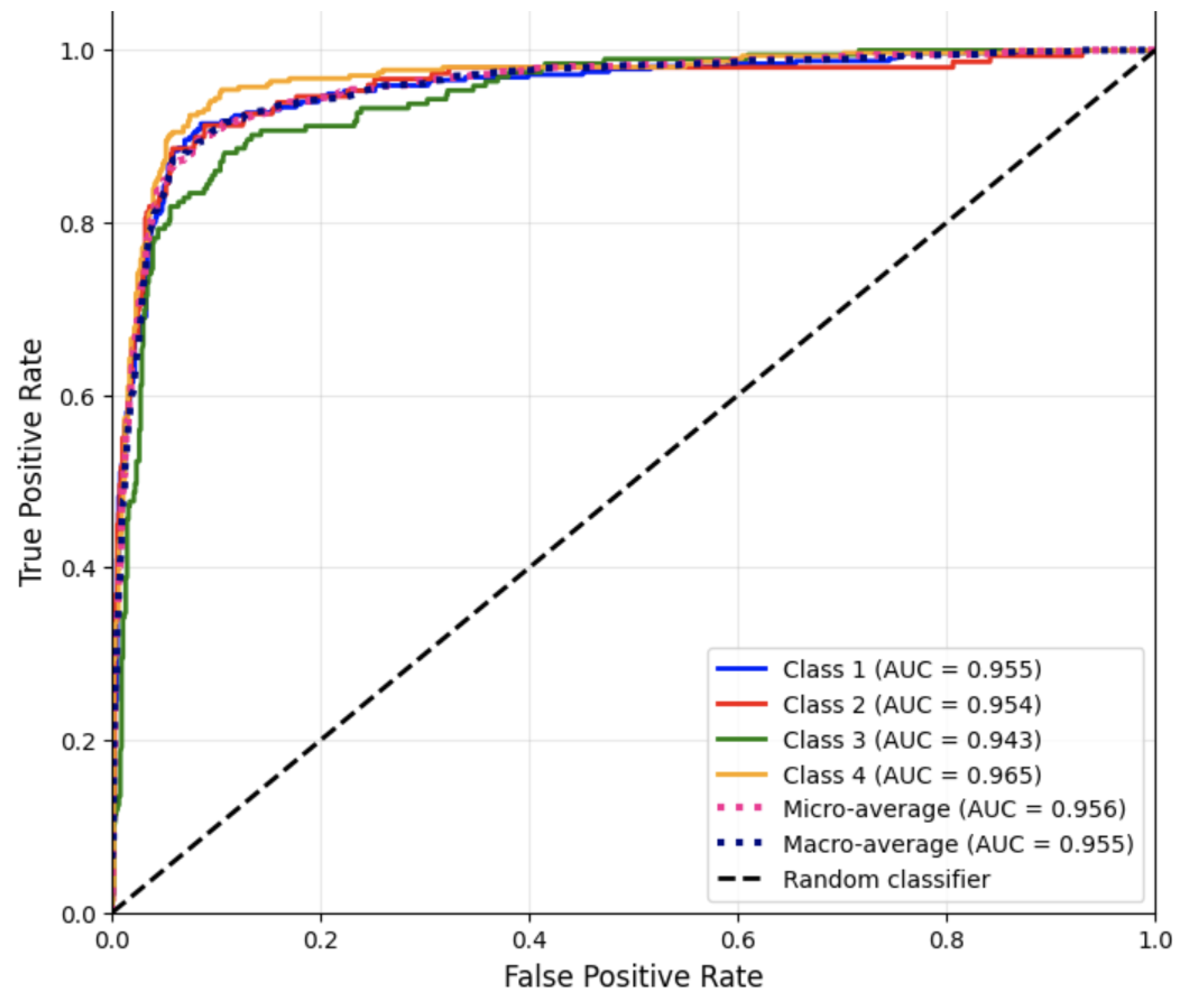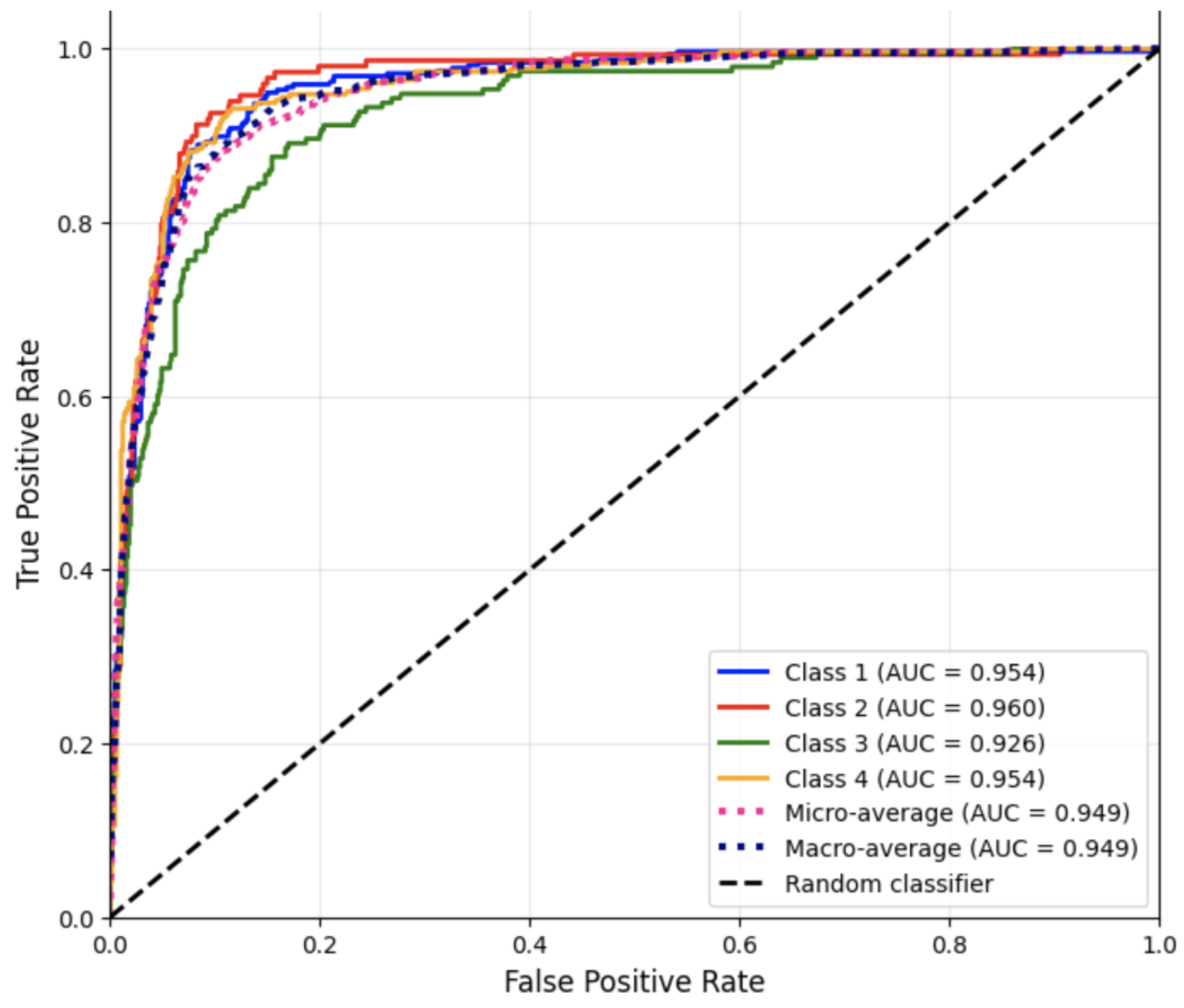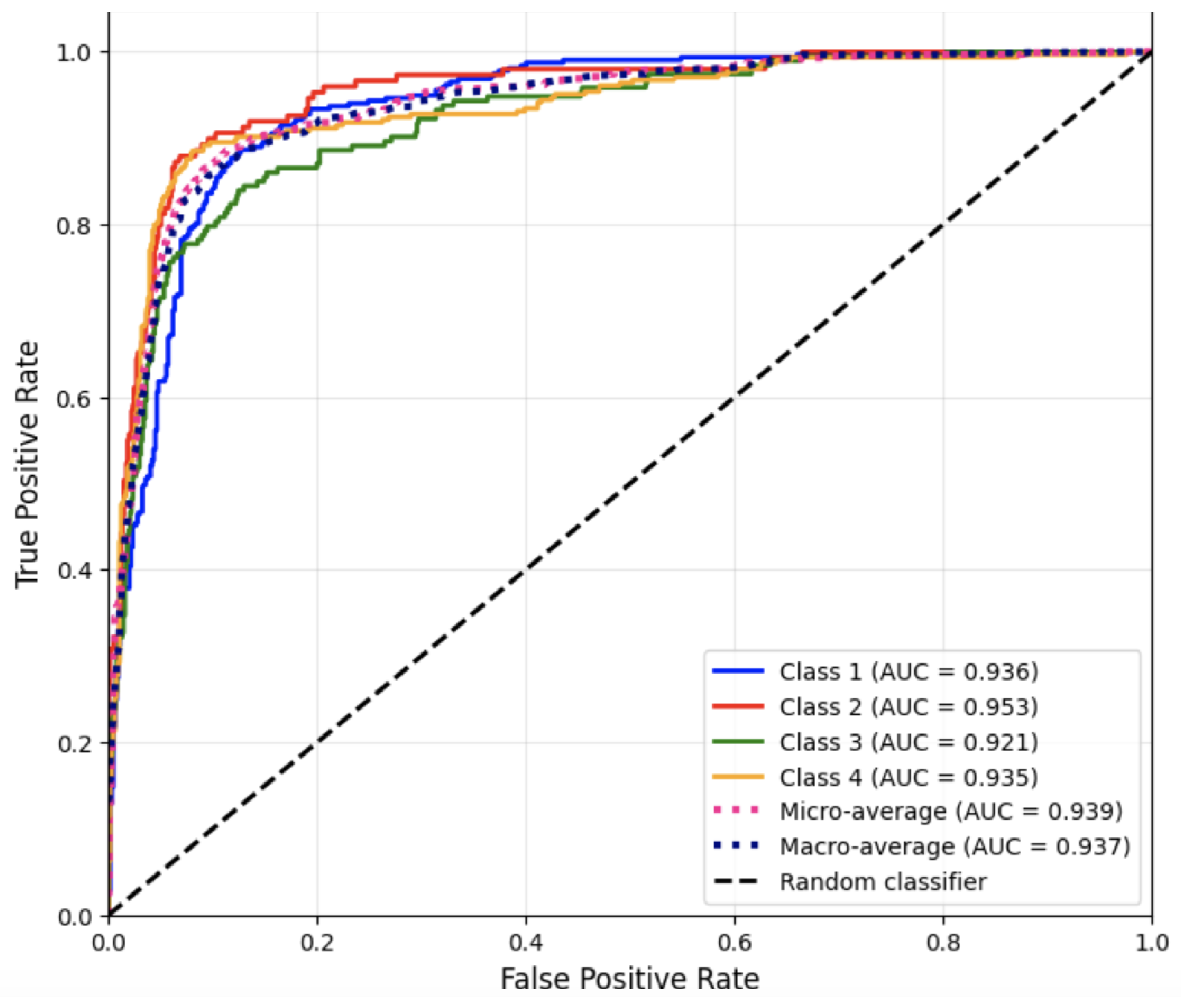These AUC results indicate separation between positive and negative classes across all disease categories. The slightly lower AUC for Class 3 reflects the higher misclassification rate observed in the confusion matrix and classification report, consistent with textual overlap between neurological and digestive case descriptions.