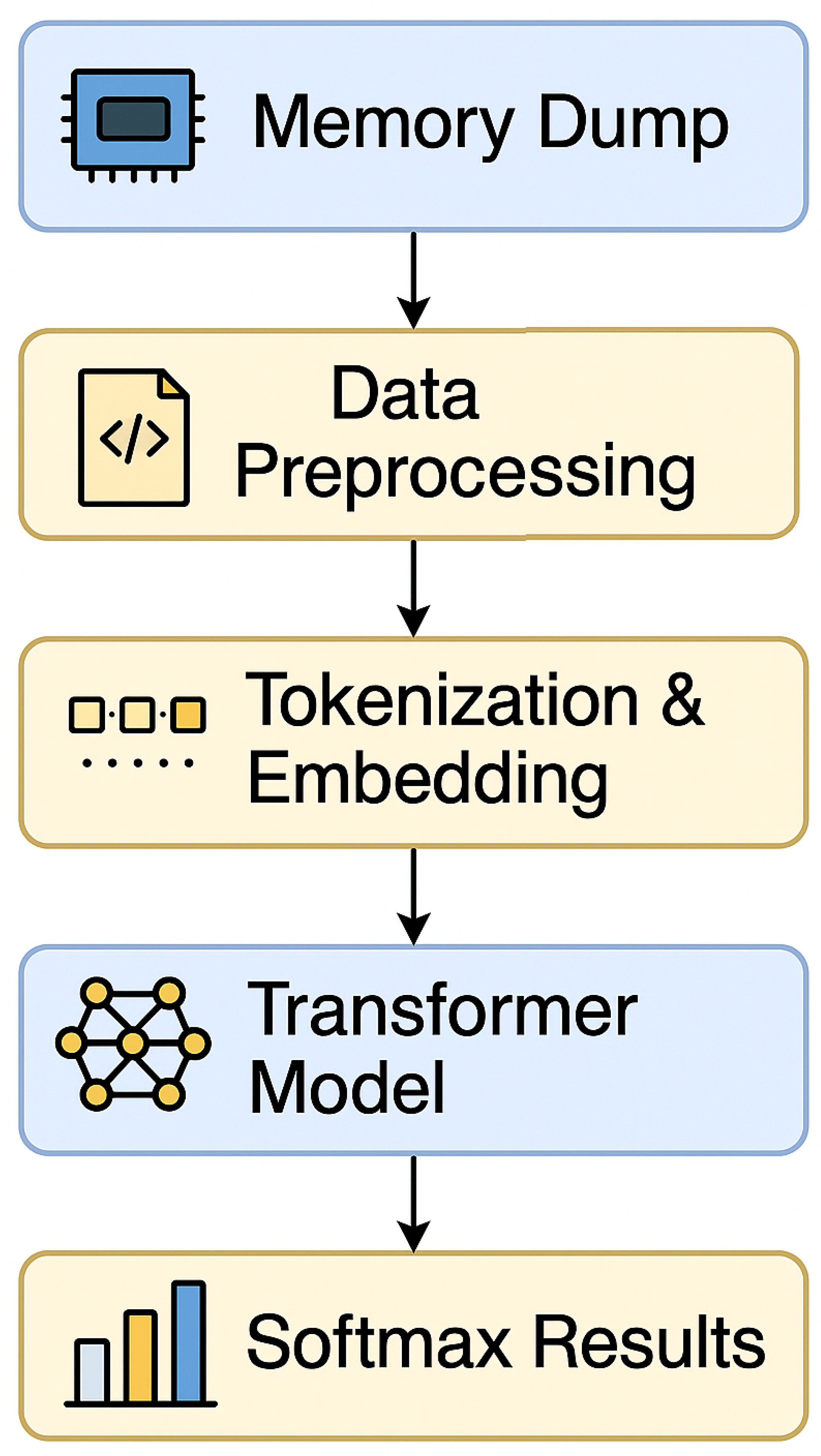 Figure 1. End-to-end transformer-based memory analysis pipeline, from memory dump acquisition to softmax behavior prediction.