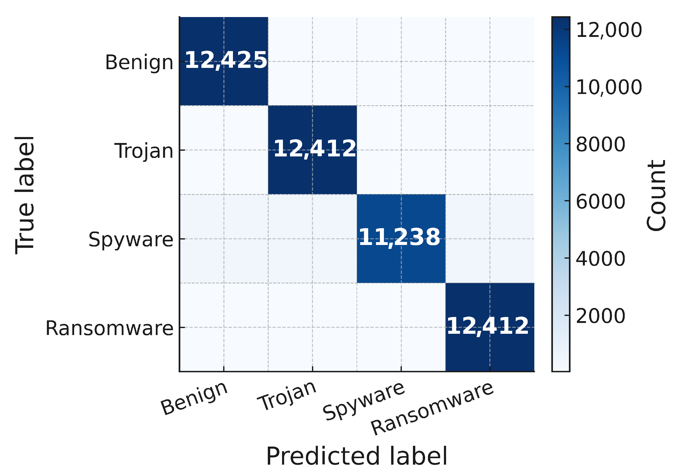Figure 3. Confusion matrix on the CIC-MalMem-2022 test set. High true positives are observed across all classes.