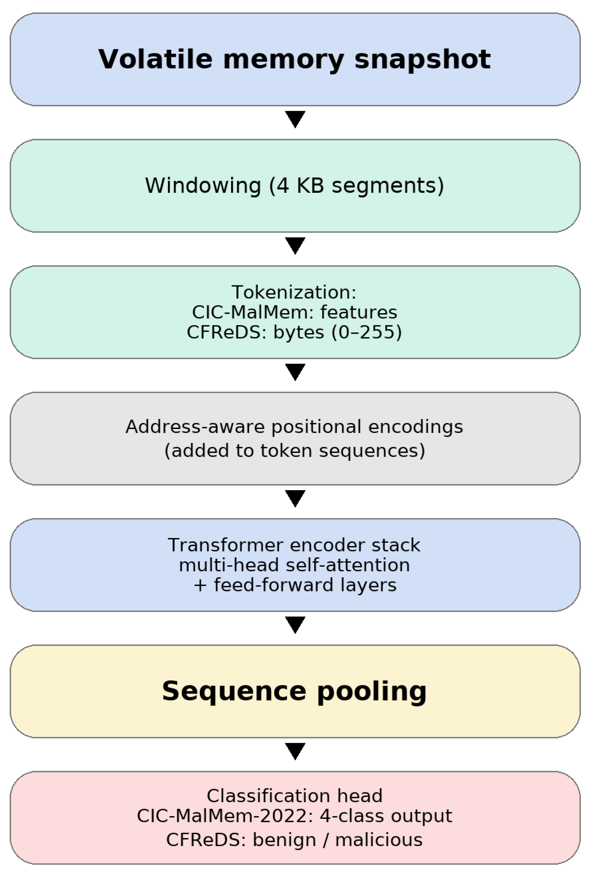 • Encoding byte-level memory as context-rich embeddings without handcrafted features (and encoding memory-derived feature vectors as tokens when operating on structured records such as CIC-MalMem-2022).